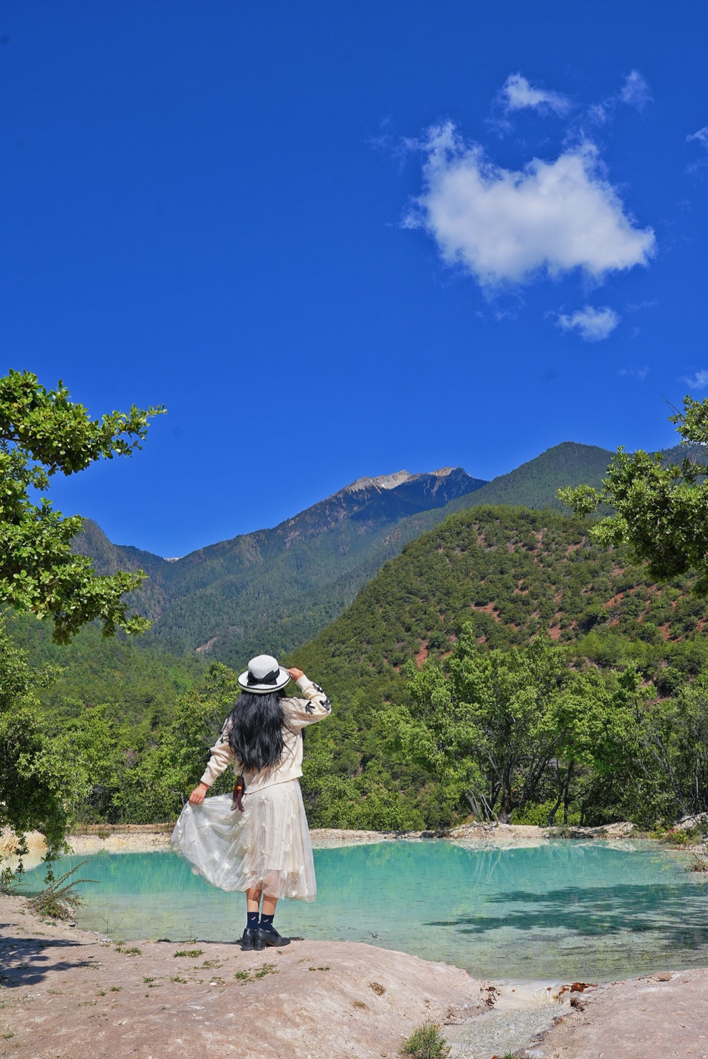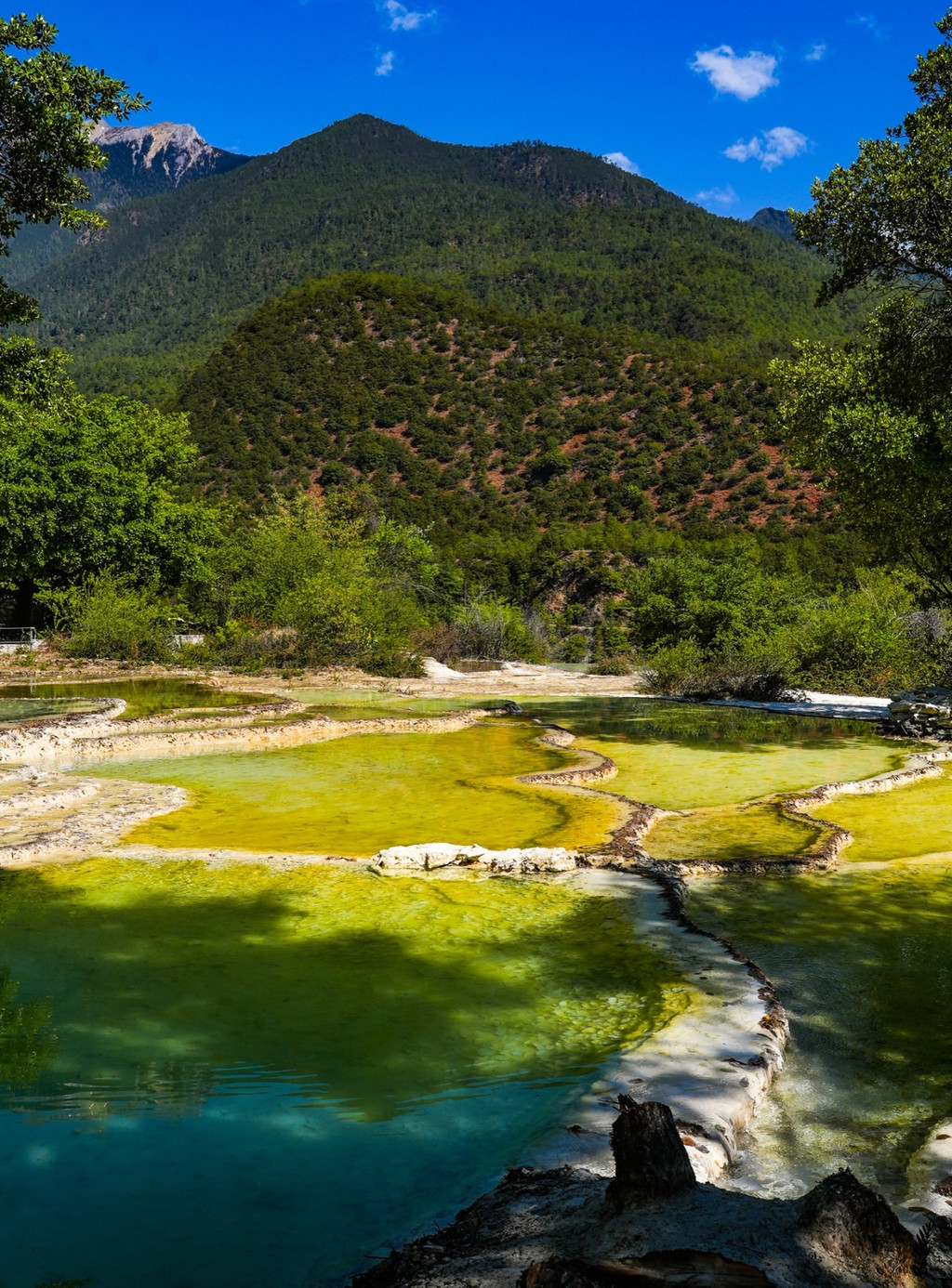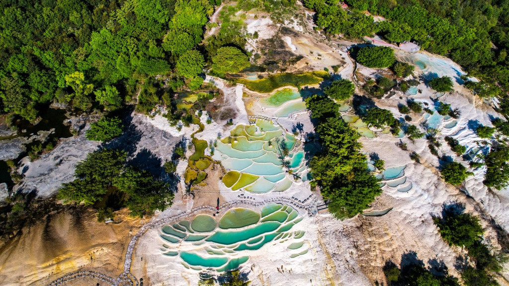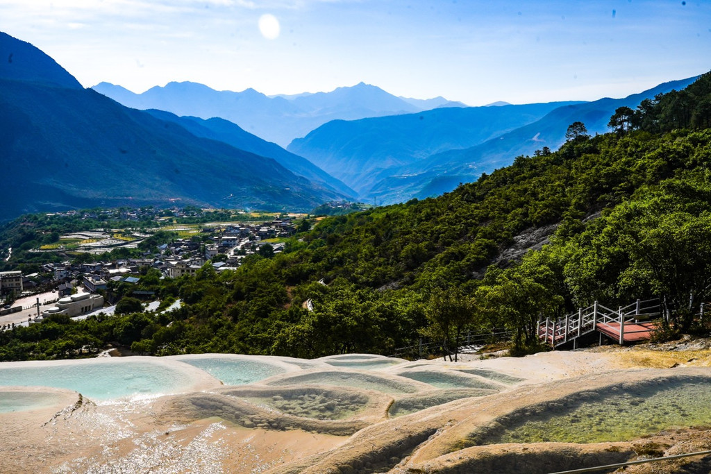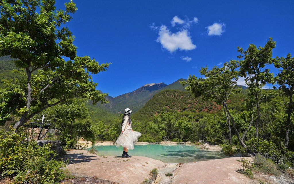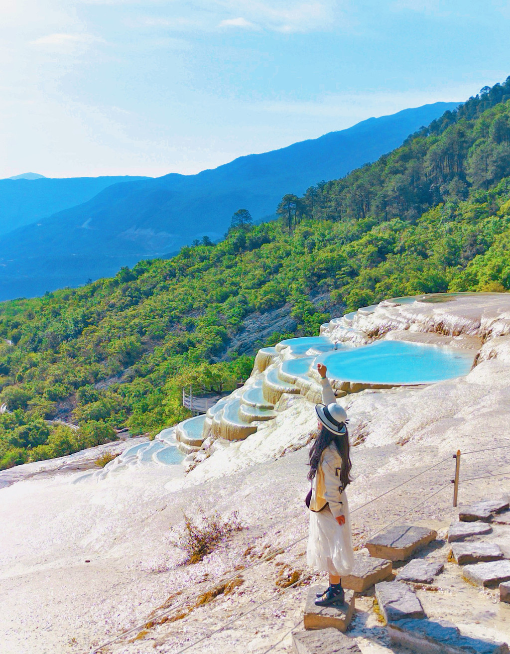那是一片宛如仙境的白色世界,层层叠叠的碳酸钙台地,在阳光的照射下,闪烁着晶莹的光芒。它们像是无数块白色的玉石,堆砌在一起,形成了一片壮观的景象。每一块台地都仿佛是大自然精心雕琢的艺术品,形态各异,却又和谐统一。初见白水台,我被它的纯净所震撼。
