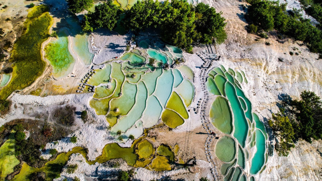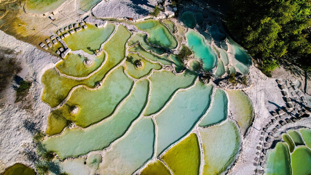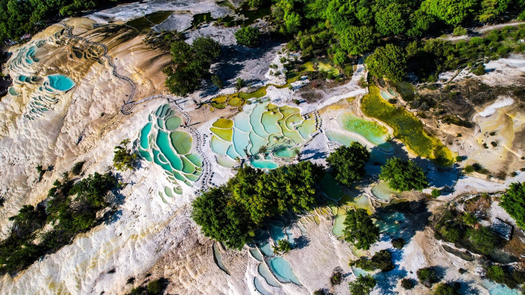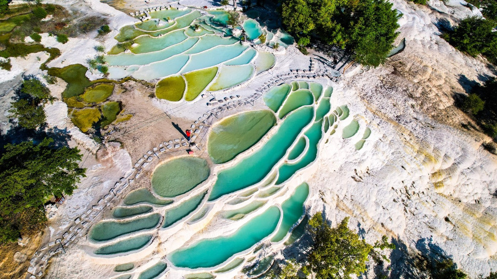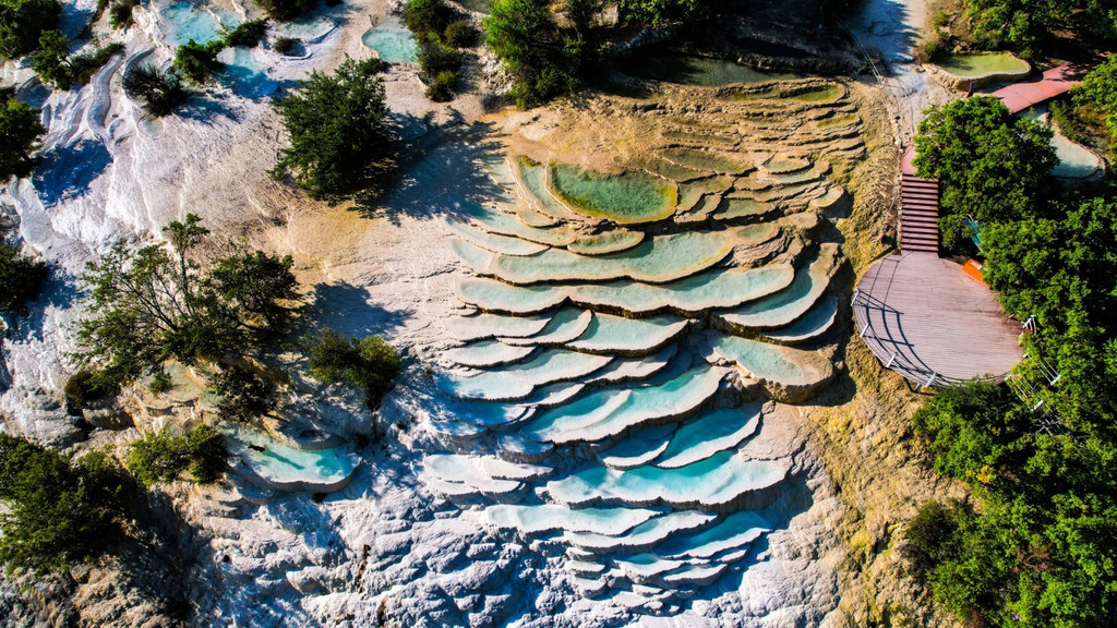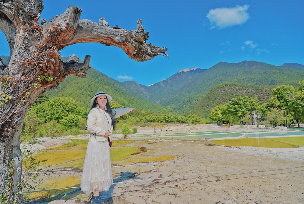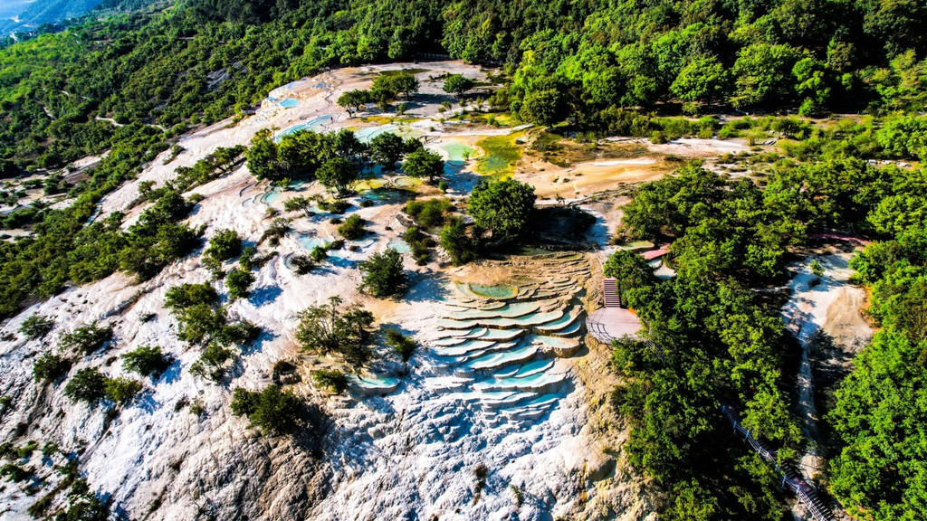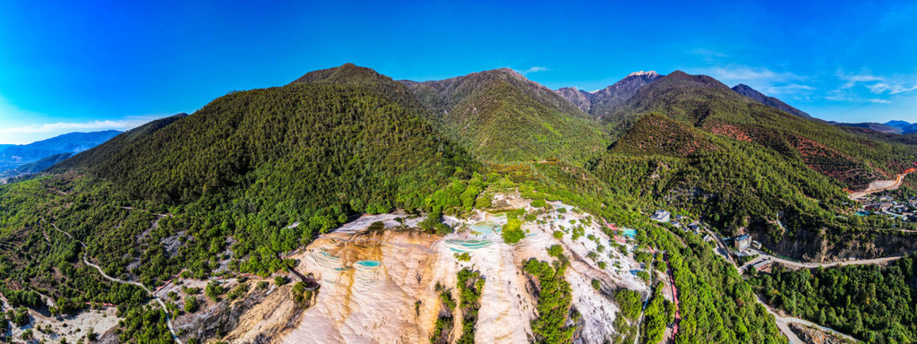 那是一片宛如仙境的白色世界,层层叠叠的碳酸钙台地,在阳光的照射下,闪烁着晶莹的光芒。它们像是无数块白色的玉石,堆砌在一起,形成了一片壮观的景象。每一块台地都仿佛是大自然精心雕琢的艺术品,形态各异,却又和谐统一。初见白水台,我被它的纯净所震撼。
