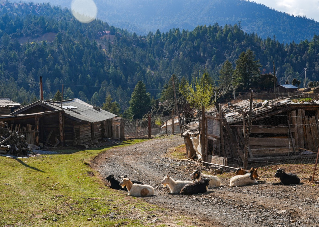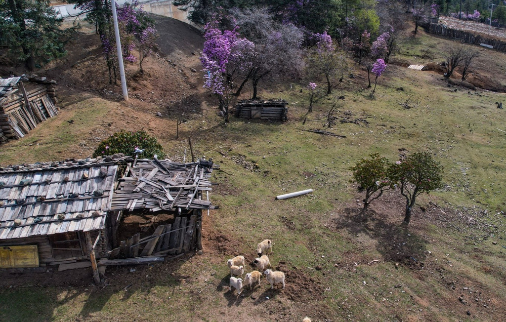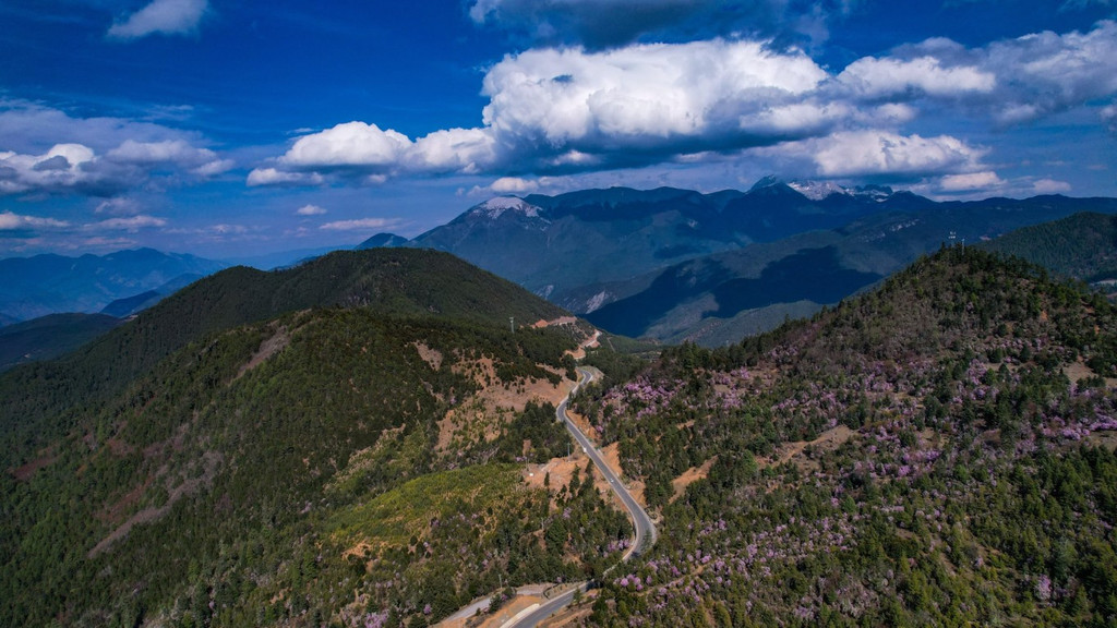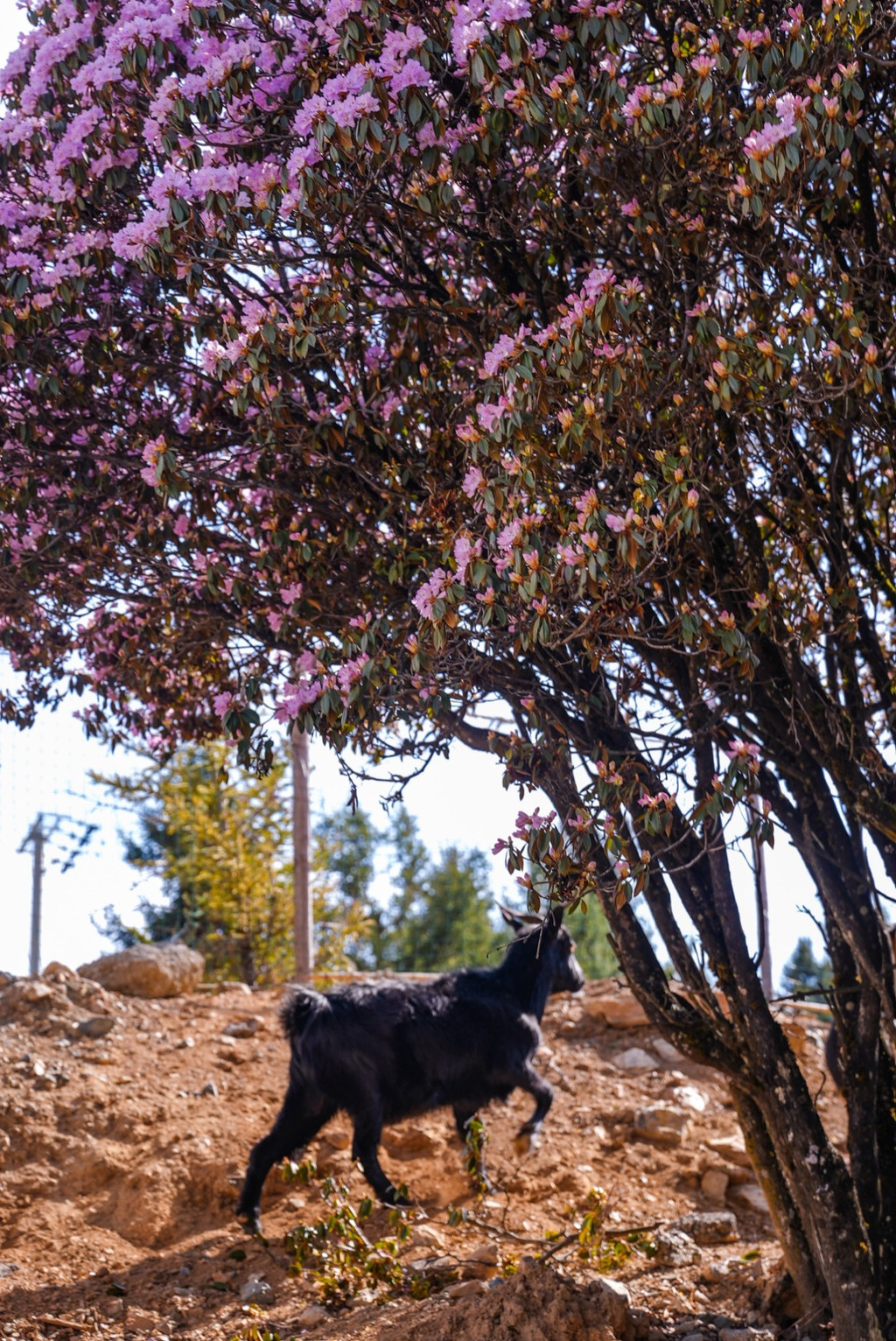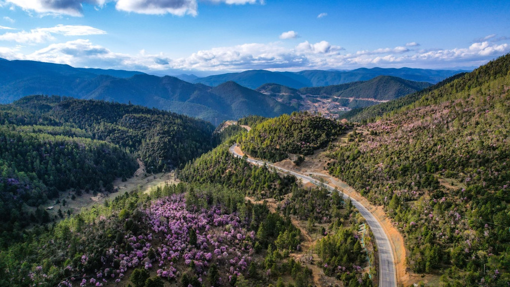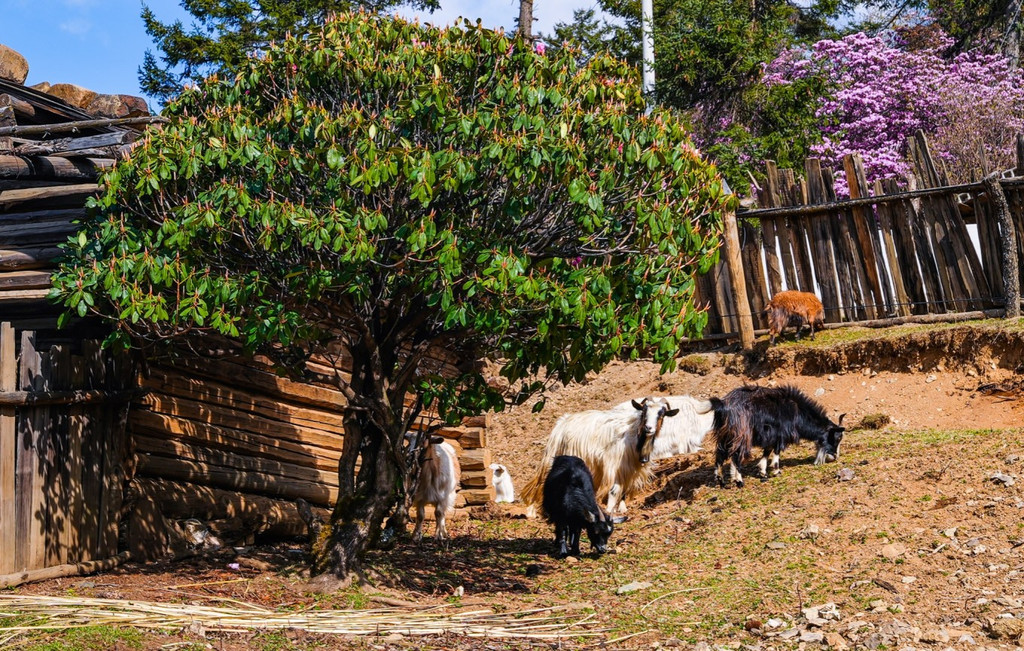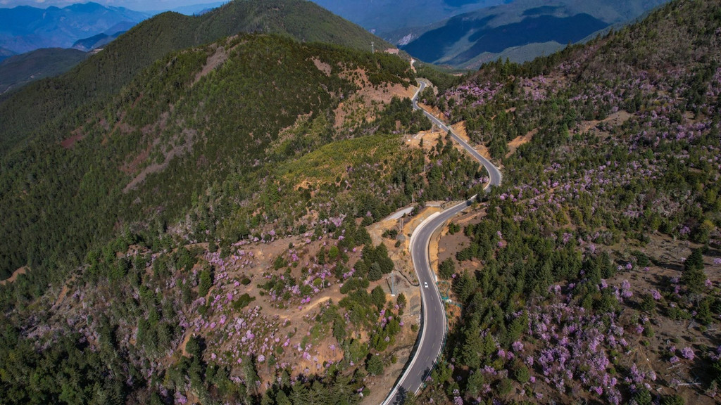 我们走过湖泊旁的村落,杜鹃花正开满垭口,