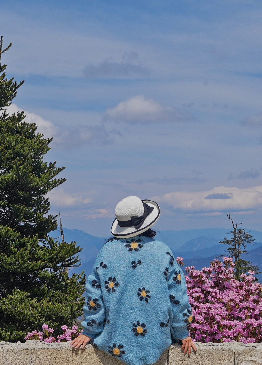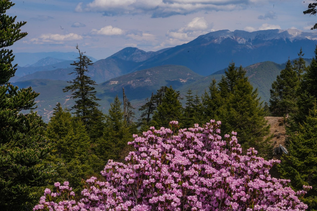 就这么一路追着花,走走停停,黄昏时分到达九仙峰观景台。站在观景台上,远处的座座山峰在眼前展露真容。它们或高或低,或远或近,相互呼应,构成了一幅壮丽的画卷。回望哈巴雪山也是云雾中若隐若现,如同仙境一般。