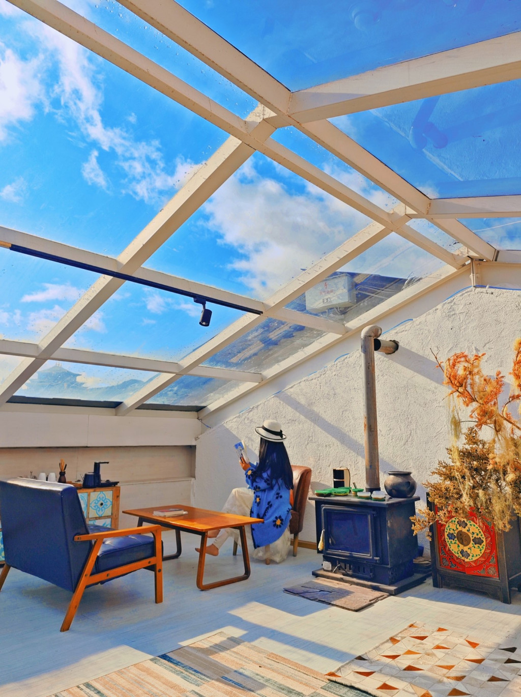 民宿顶楼的超大观景露台简直是一绝,在这可以俯瞰整个独克宗古城,远处的山峦、古老的寺庙、热闹的街市,一切都如画卷般展现在你的眼前。还有旁边的阳光玻璃房也很nice。我在这吃早餐、享用下午茶还有看书,一呆就是半天。