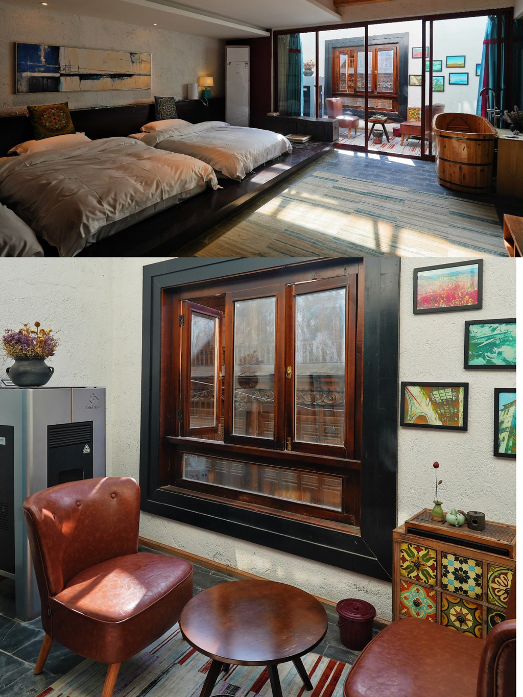 这次幸好选对了民宿,一走进乐兮,就感受到浓郁的藏族风情。粗犷的石墙、精美的雕刻、艳丽的色彩,还有围炉、乐器、壁炉、实木家居、柔软的织物,温暖的灯光和细节的装饰,每一个角落都透露着主人的用心,让你仿佛回到了家一般。