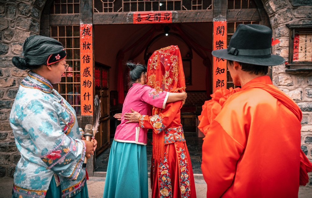 迎亲队伍吹吹打打,新娘被迎入新郎家,新郎新娘双方拜完堂后,新人在众多游客的拥簇下被送入洞房。在众人的嬉笑打闹中,新人礼成。