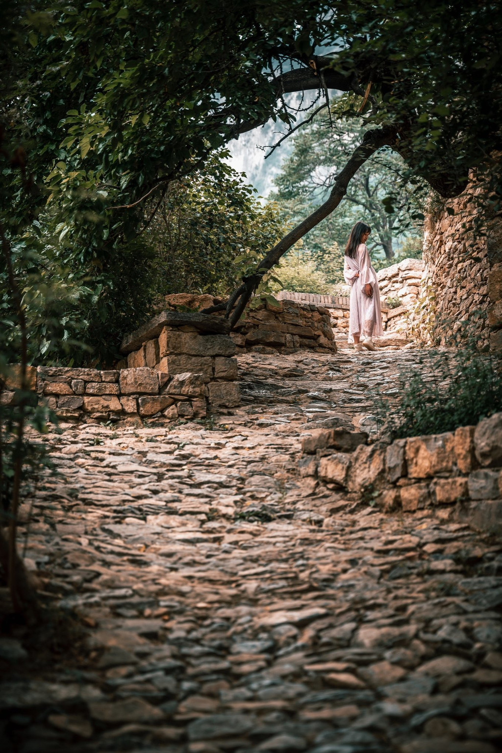 村子沿山而建,被山间的古树包围,塔尔坡村的先民就世代居住在这里繁衍生息的。我特别喜欢那一条条蹭得发亮的石板路,穿行在山林中,据说这是塔尔坡古村的先民们铺就的,至今也是村子里主要的往来通道。