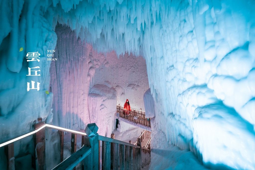 世界上不乏这样的低纬度冰洞,而云丘山冰洞群属世界罕见的超大冰洞群,洞穴相互贯通,蜿蜒曲折,总长100多米,最高处有15米,洞内四壁结冰,在五彩灯光的映照下呈现出梦幻般景象,犹如龙宫御舍。