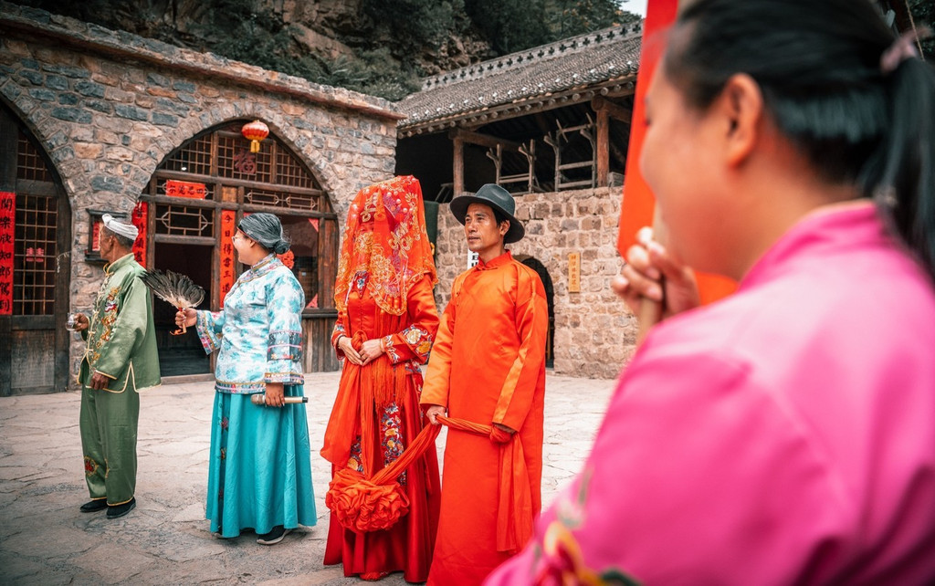 另一个更大型的表演是云丘山的婚俗文化,这数百年的习俗保留至今,于是在塔尔坡古村的广场上,用婚俗表演还原了古时娶妻的欢乐场景。
