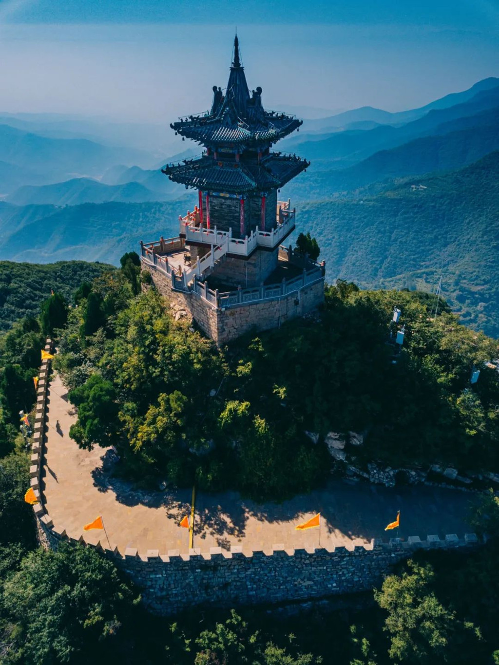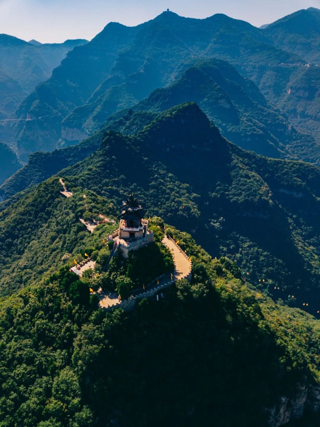 云丘山的第二高峰上,一座建筑耸立于山峰之巅,气场非凡,它就是祖师顶。此地群山环绕、风光无限,游客登阶而上,虔诚拜谒祖师,便可成仙。