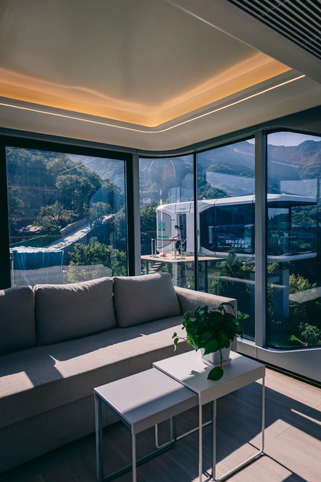 除了登山可以一览祖师顶风貌之外,还有一个地方足不出户便可见祖师顶。轻野HOME,270°落地玻璃窗直面山峦。轻野HOME的造型极具未来感,每一个房间都是独立的太空舱,270°环绕立体窗,让人不出舱门就能尽赏美景;虽然空间不大,但是设施齐全,舱内采用先进的智能家居系统,只需语音就可自由操控,彻底解放双手,享受舒适的居住体验。当遥望见伫立在山巅之上的白色太空舱时,我便知道这是就是要寻找的地方。 那一夜在星空下我真诚地最后一次呼叫了舰队指挥官:轻野号登陆舱已着陆911天,这里光照充沛、降水适中、植被茂盛,可以自由呼吸,登陆舱燃料耗尽无法升空,登陆舱目前能提供生存环境,呼叫舰队幸存者登陆……
