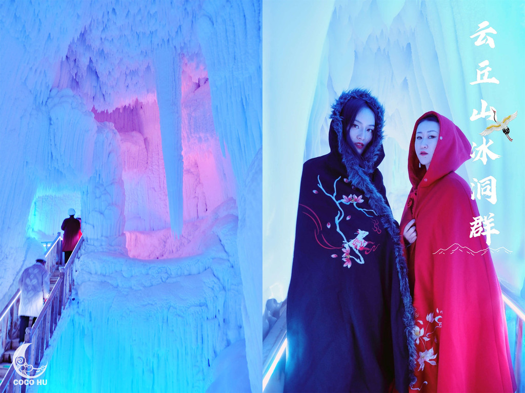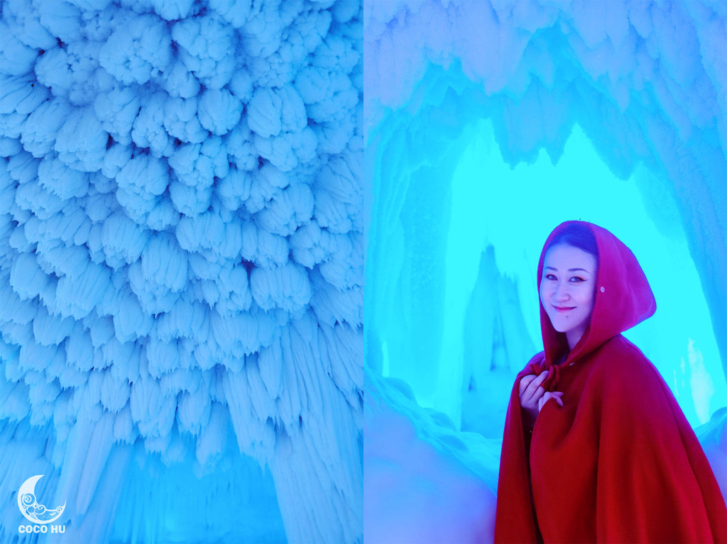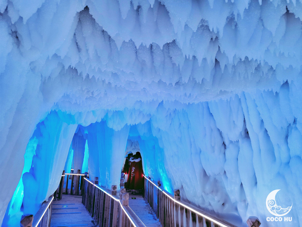 整个冰洞群由11个洞腔组成,总长度100多米,最宽处12米,最高15米,洞内4壁结冰,冰柱、冰笋、冰钟乳、冰石花分布整个空间,大大小小的冰凌晶莹剔透、峰峦叠嶂,在五彩灯光的映衬下,俨然仙境~