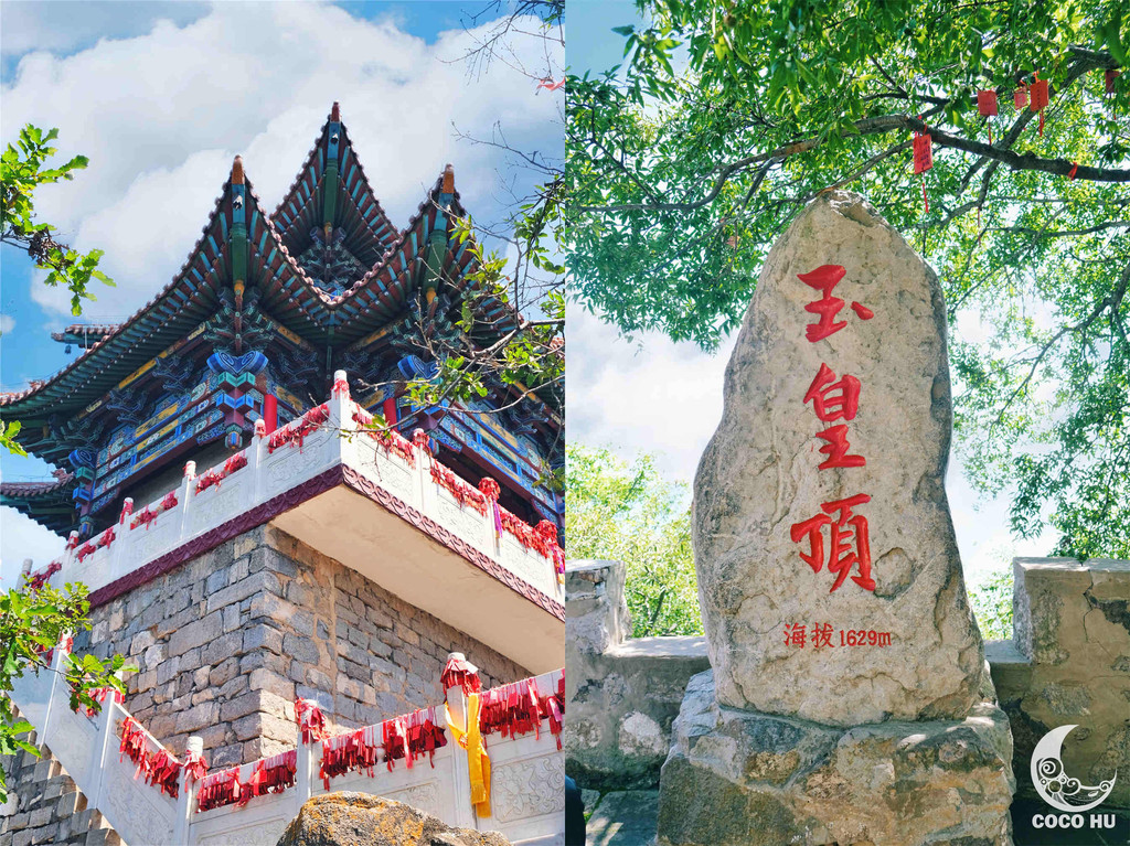 登上山顶便是玉皇阁,玉皇阁长6.4米,宽6.32米,高15米,是一座建在无梁殿上的重檐十字歇山顶的阁楼,四周有汉白玉围栏。内供奉玉皇大帝、日、月神。