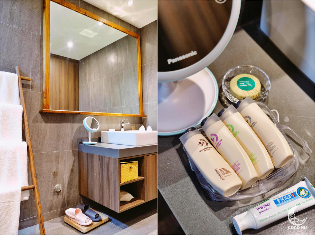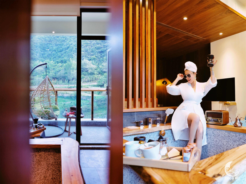 房间内超大的方形泡汤池,面对着落地窗与远山美景,由内而外一扫旅途疲累;手磨咖啡和管家手写慰问卡,让人倍感温暖~在深山古村落中,能喝到手磨咖啡,真的幸福到要飞起!