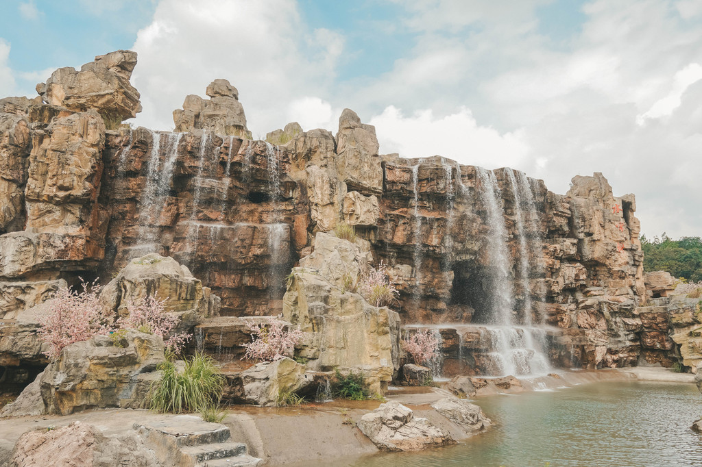 这里的山岩是从真实的石头上翻制下来,周围包括棕榈在内的十多个品种的植物都是高仿真植物,因为场景太过逼真,现场有穿着神似美猴王的游客打卡拍照,一举一动,颇有几分六小龄童的影子。