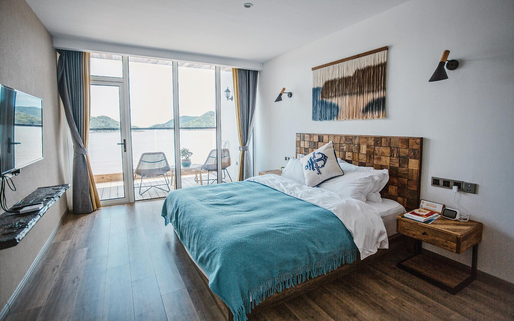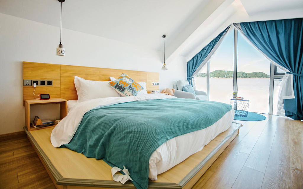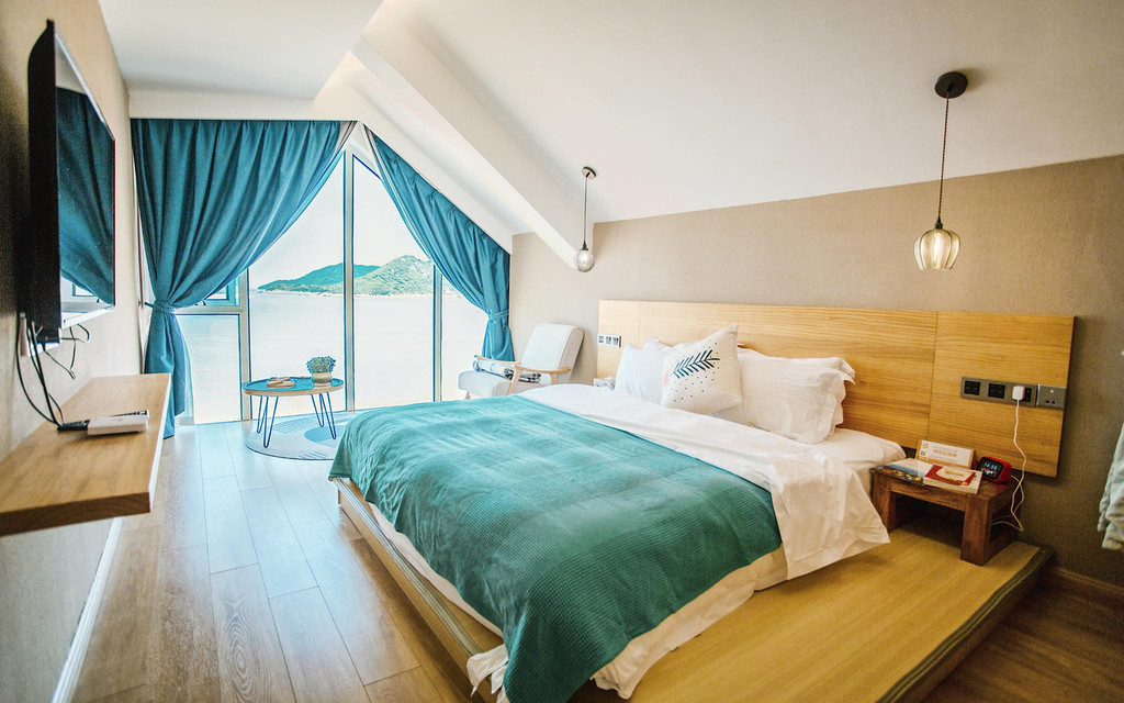 而这里的每个房间都正对着沙塘湾的大海,没有任何遮挡,运气好的时候还可以看到远处停泊在海中的船只,海与光在这里相互辉映。