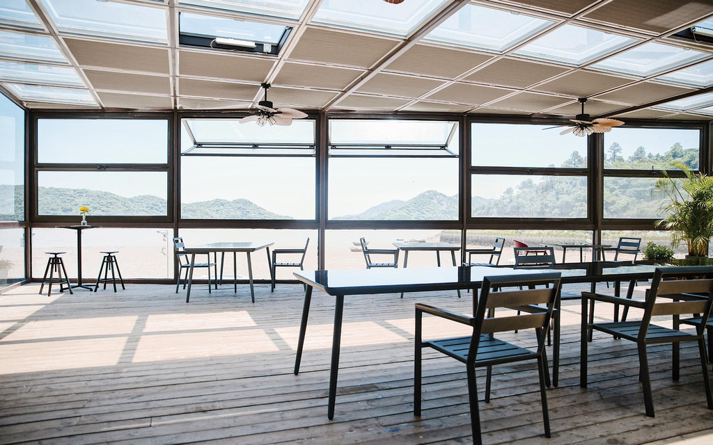 这里的就餐环境十分简洁明快,天花板的透光性也非常好,让你观赏山海秘境的同时也能身处阴凉和惬意。
