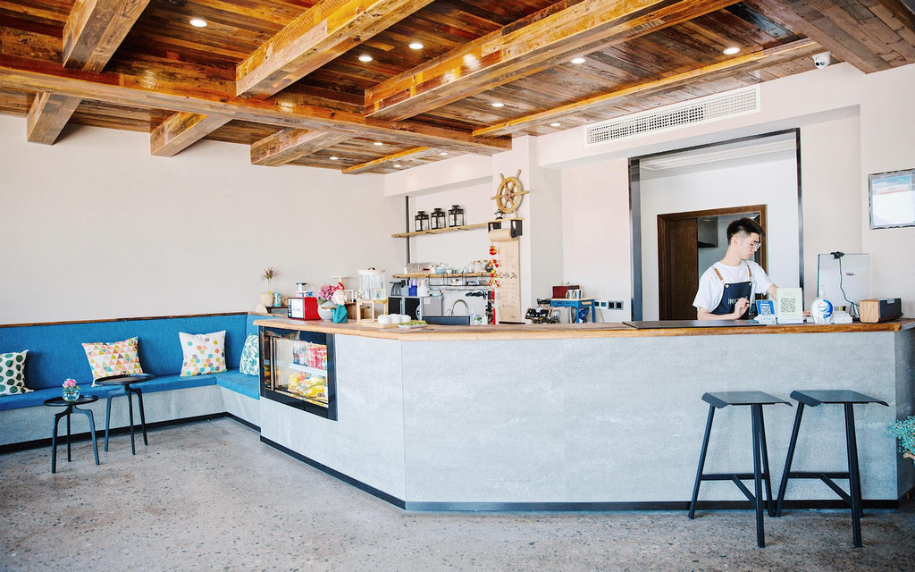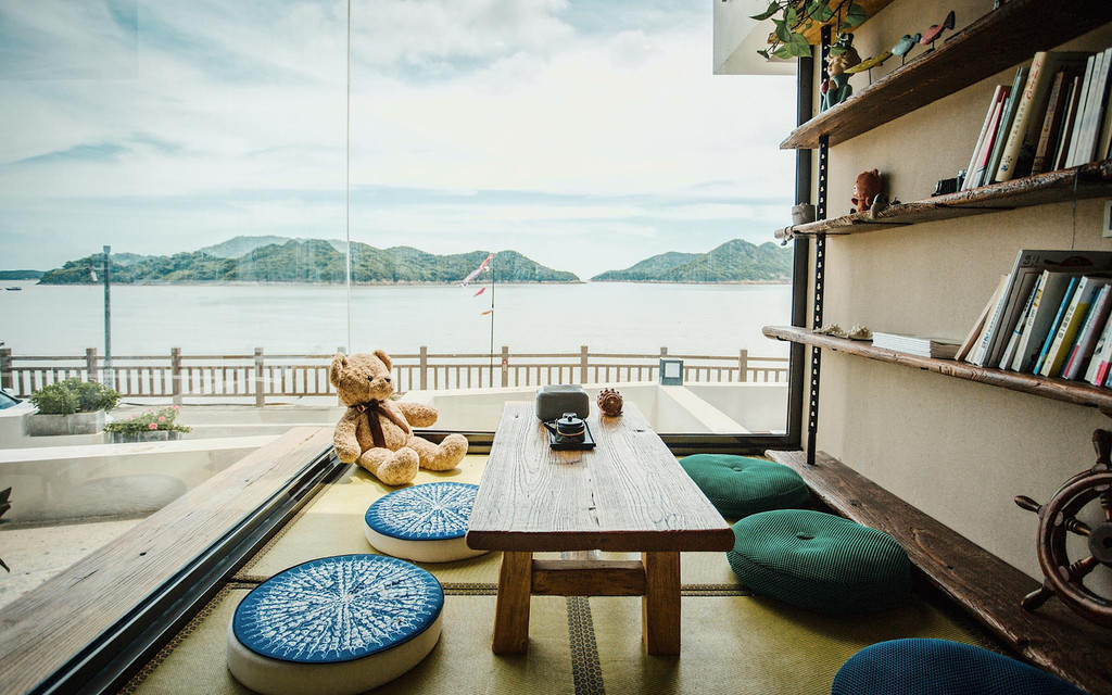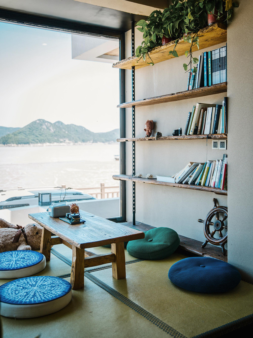 书吧里的书都可以随意翻阅,配合着几个小铺团和绵长的茶香,一定能让你重拾阅读之趣,一个人也不用觉得孤单,有只蠢萌蠢萌的小熊一边观海一边陪你。