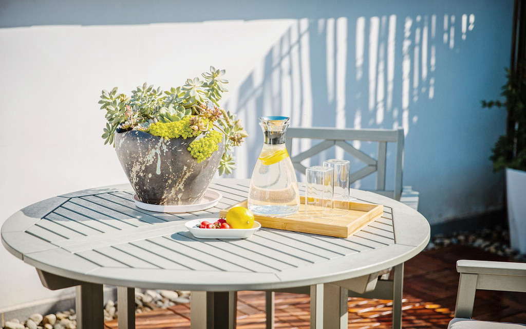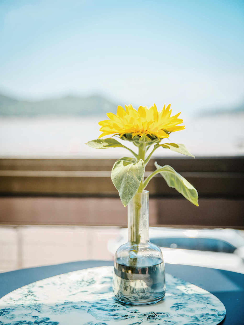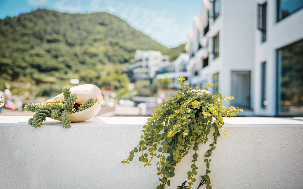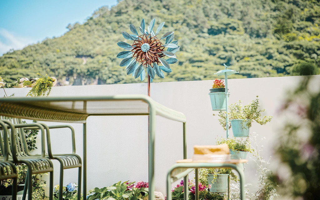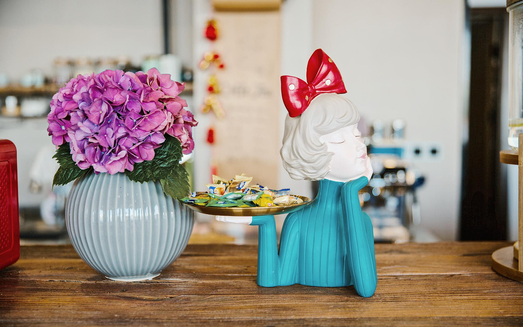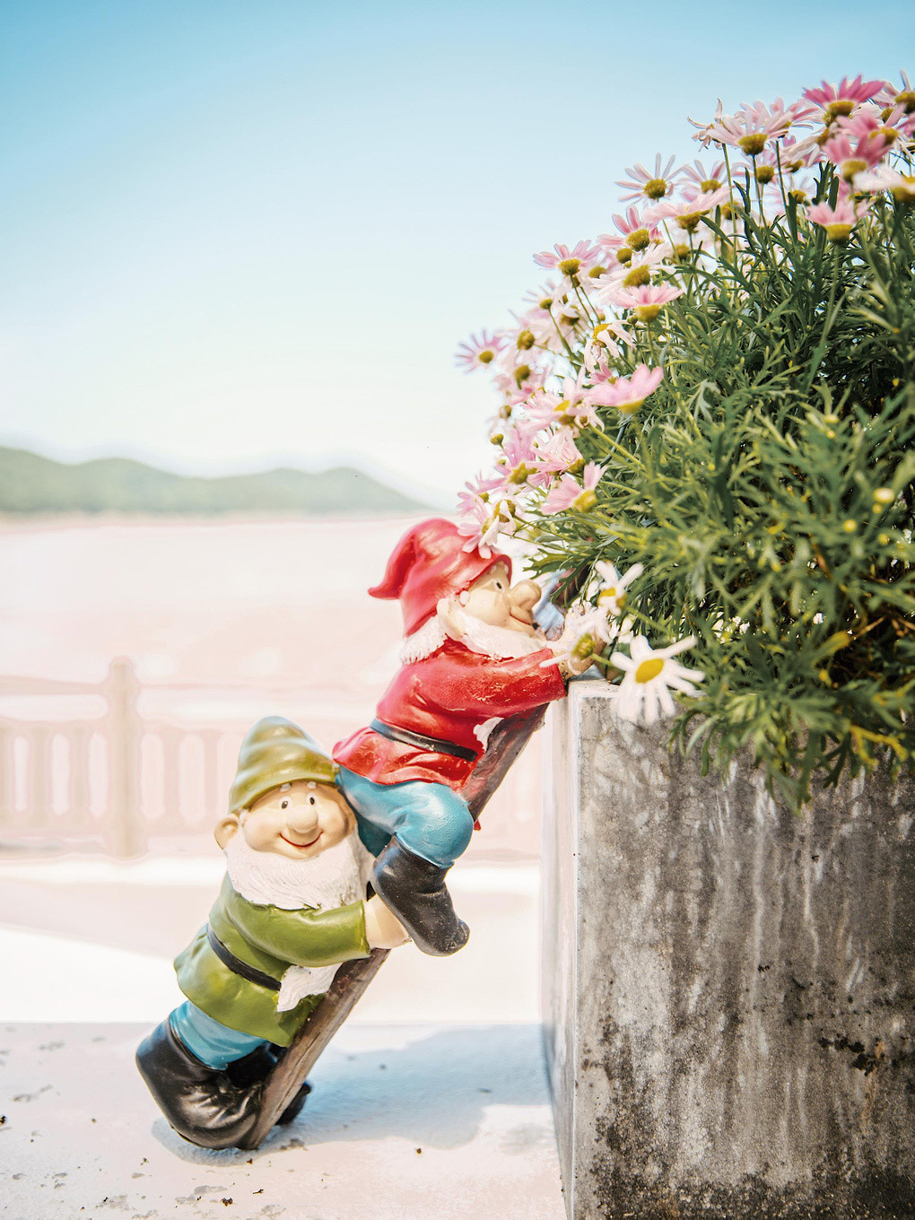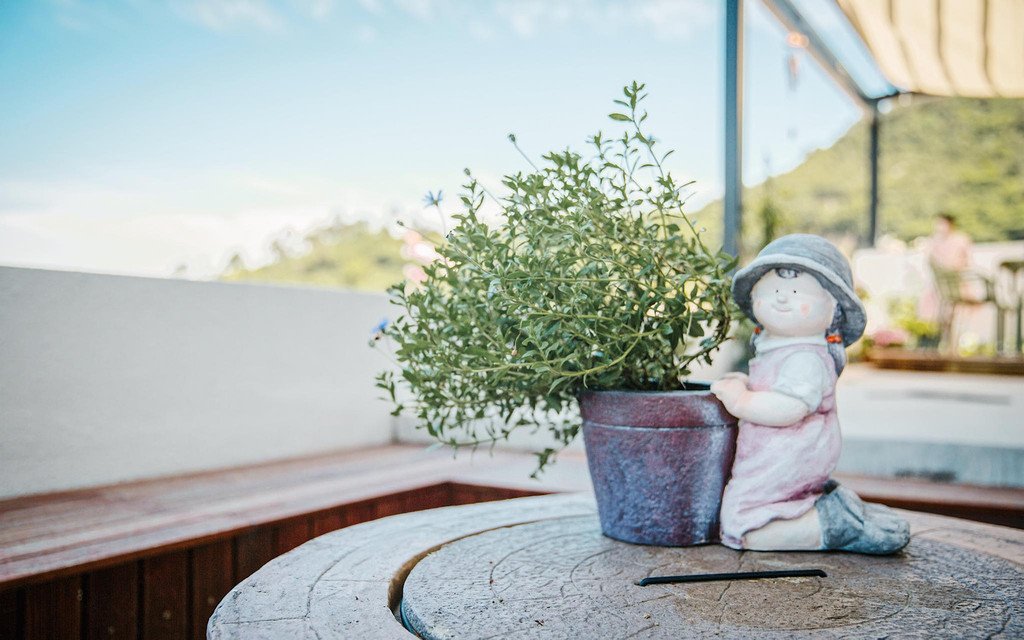 办理好入住后,我们来到了室外的休憩区品味下午茶。这里的绿植氛围也特别棒,不管是多肉还是小雏菊,都长势喜人,听说这里的小物件都是老板娘亲自选的,小矮人雕塑轻嗅花香的样子也给这里的简单中寓于了几分生机。