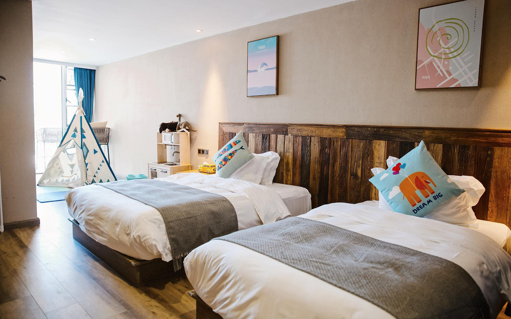 和闺蜜顺道还参观了一下这里的其他房型,最喜欢的当属童趣家庭房了,这里里配有各种毛绒玩具,小汽车、积木等等以及画着宇宙星球的地毯,撞色的房间色调明快大胆,随手一拍就是不用修图的亲子合照。家具尽量采用圆角设计,不用担心玩耍时的安全问题。