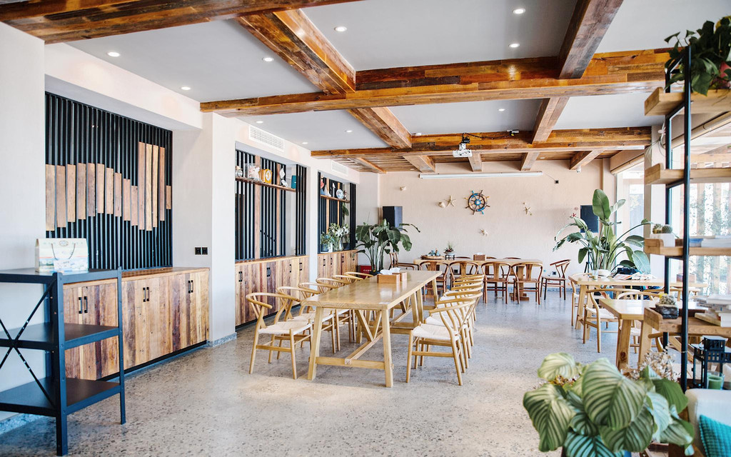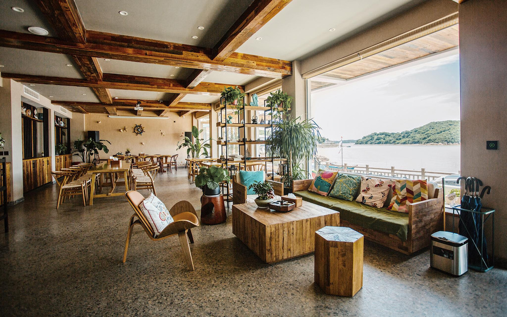 休闲餐区的桌椅都是原木风格,一砖一瓦,一厅一室,都交织着现代与传统的碰撞,配合着硕大的芭蕉叶更显自由随性的布局和原生态的质感,远处就是大海和青山,显得格外诗情画意。