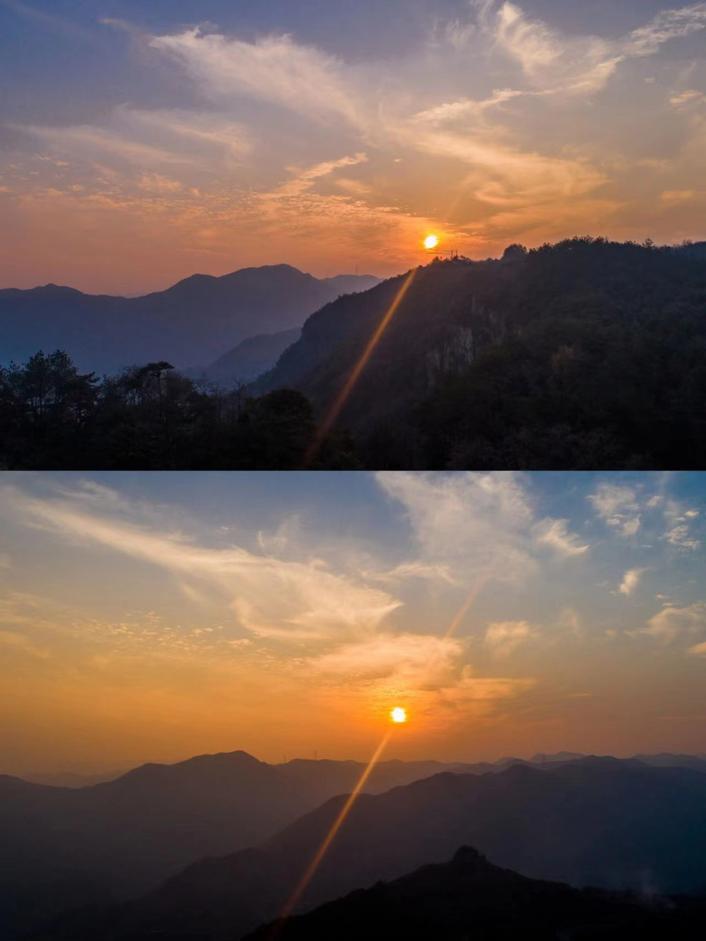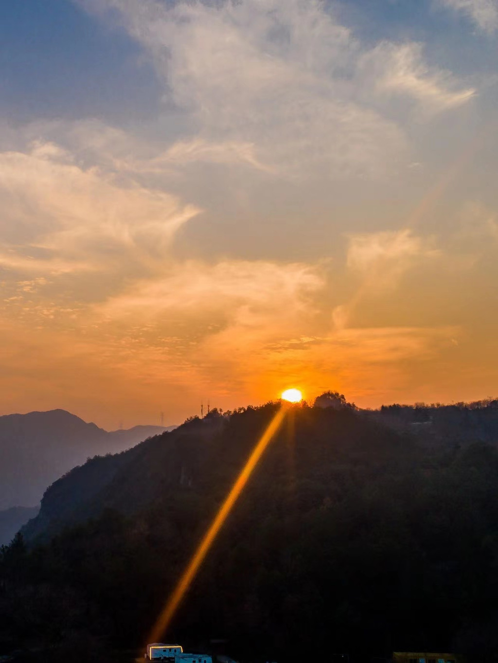 站在栈道上极目远眺,绿色的山峦被染成橘红色,半个太阳沉入山脉,天色渐暗,却依旧流连忘返