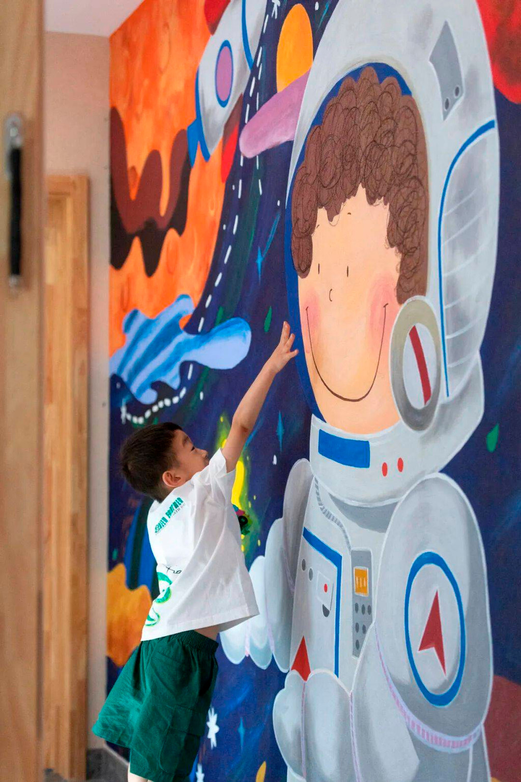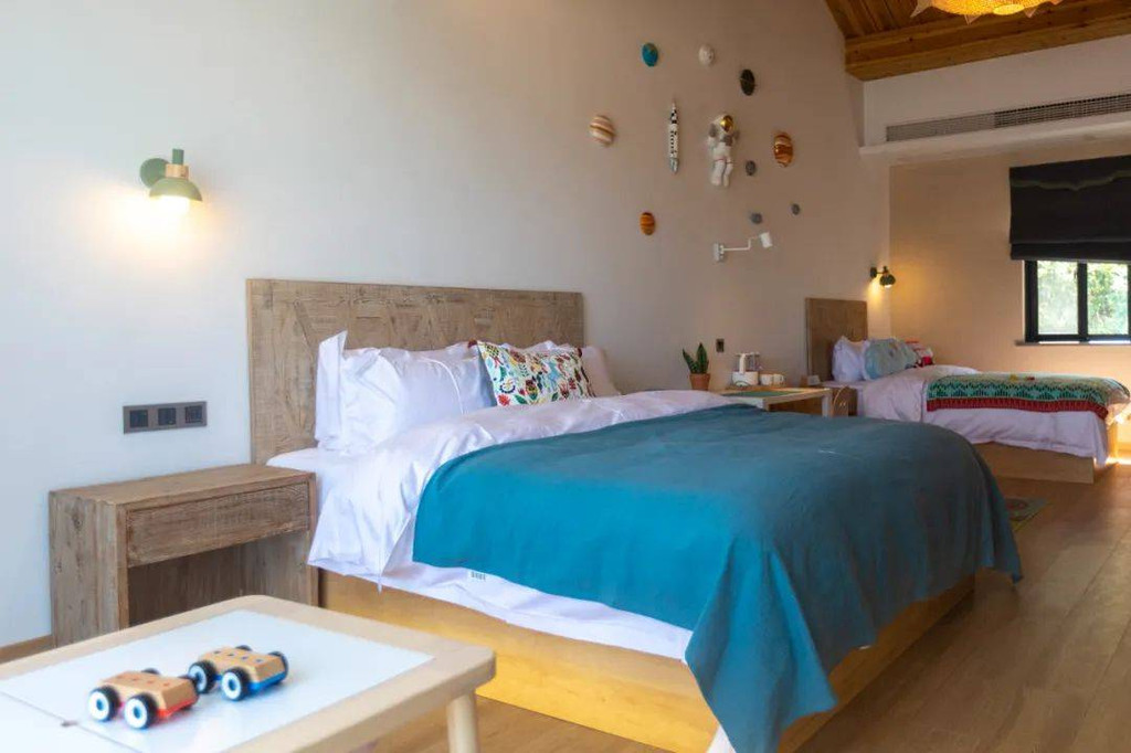 二楼是两间星空主题的亲子套房,深邃的星辰和辽阔的大海相得益彰。