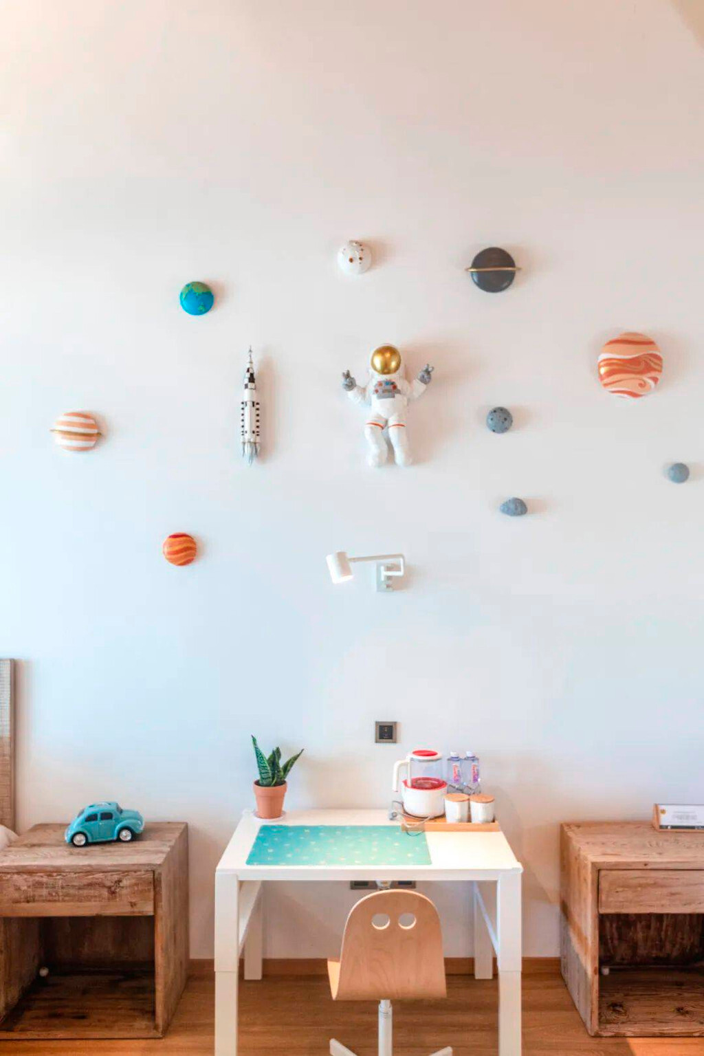 墙上挂着星系图和火箭的装饰,儿童床上摆着汽车抱枕,一切都是辉哥喜欢的模样,假装开着双层巴士,登上火箭去遨游浩瀚无垠的星辰大海,儿童桌和榻榻米就成了儿童乐园。