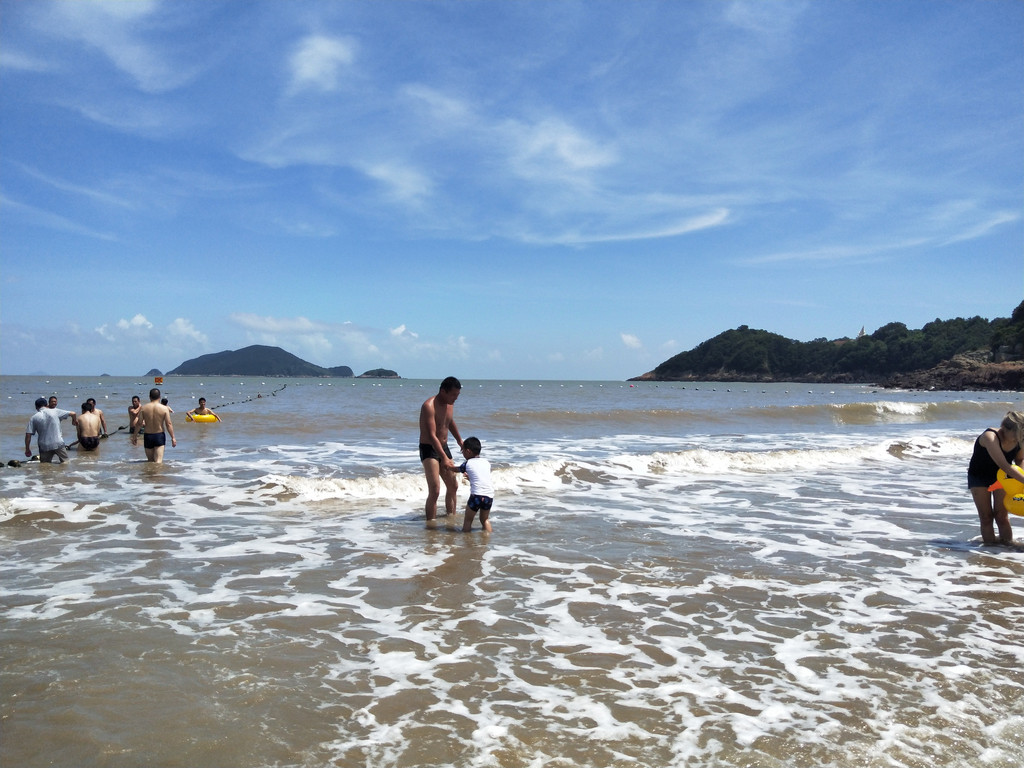 走过去就是东沙滩了,这里也有很多游客泡在海水里。可能这里的水要深一些,还真有游泳健将在大海里尽情遨游。要说我们的游泳技术,只能在游泳馆里玩玩,在海里还是要抓着救生圈才安心的。