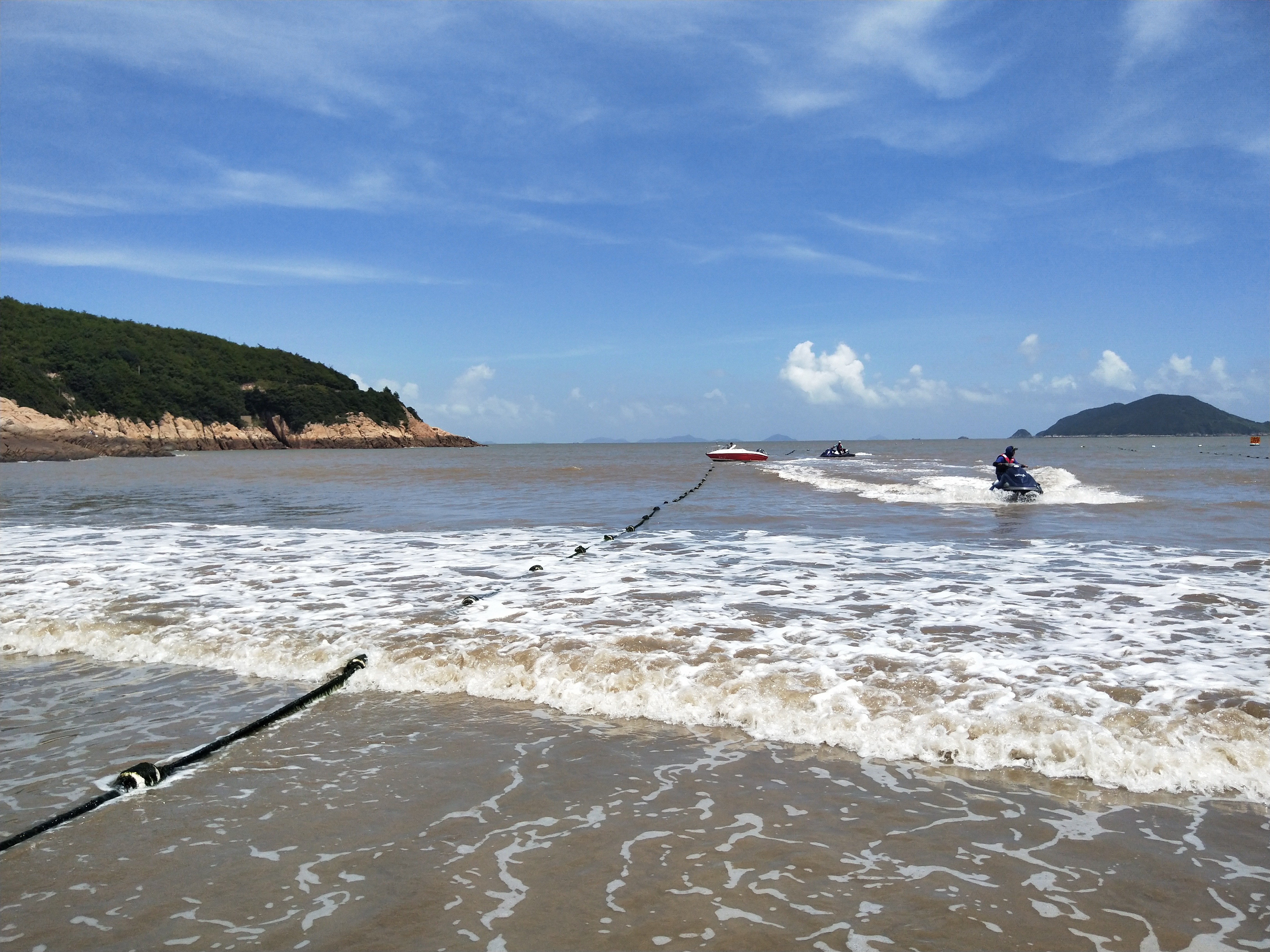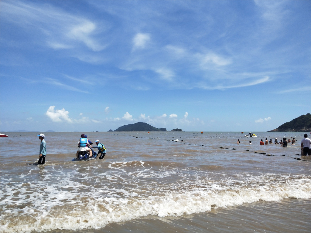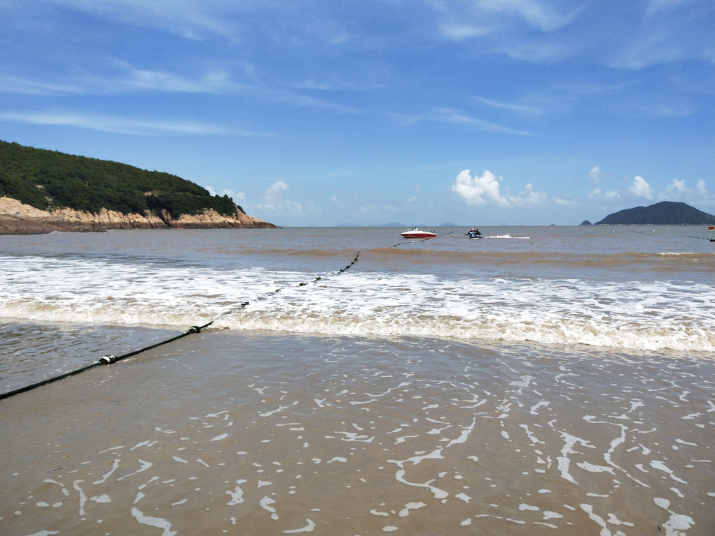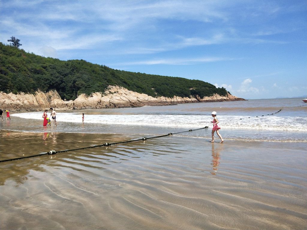 东沙滩长900米,宽200米,面积约15万平方米,比南沙滩还大一些,是华东地区最大的陆岸沙滩。海湾平均水深1.4米,也有大片的沙滩浴场,深线外是冲浪、滑板、快艇、摩托艇活动区,外侧就是帆板、帆船训练区。