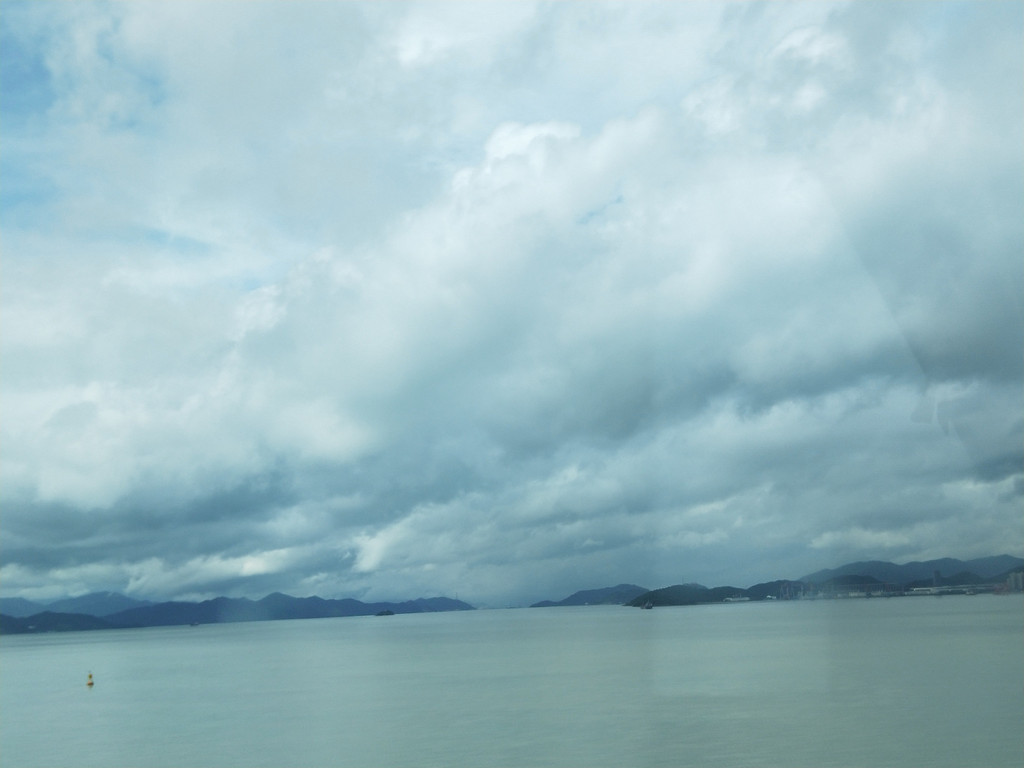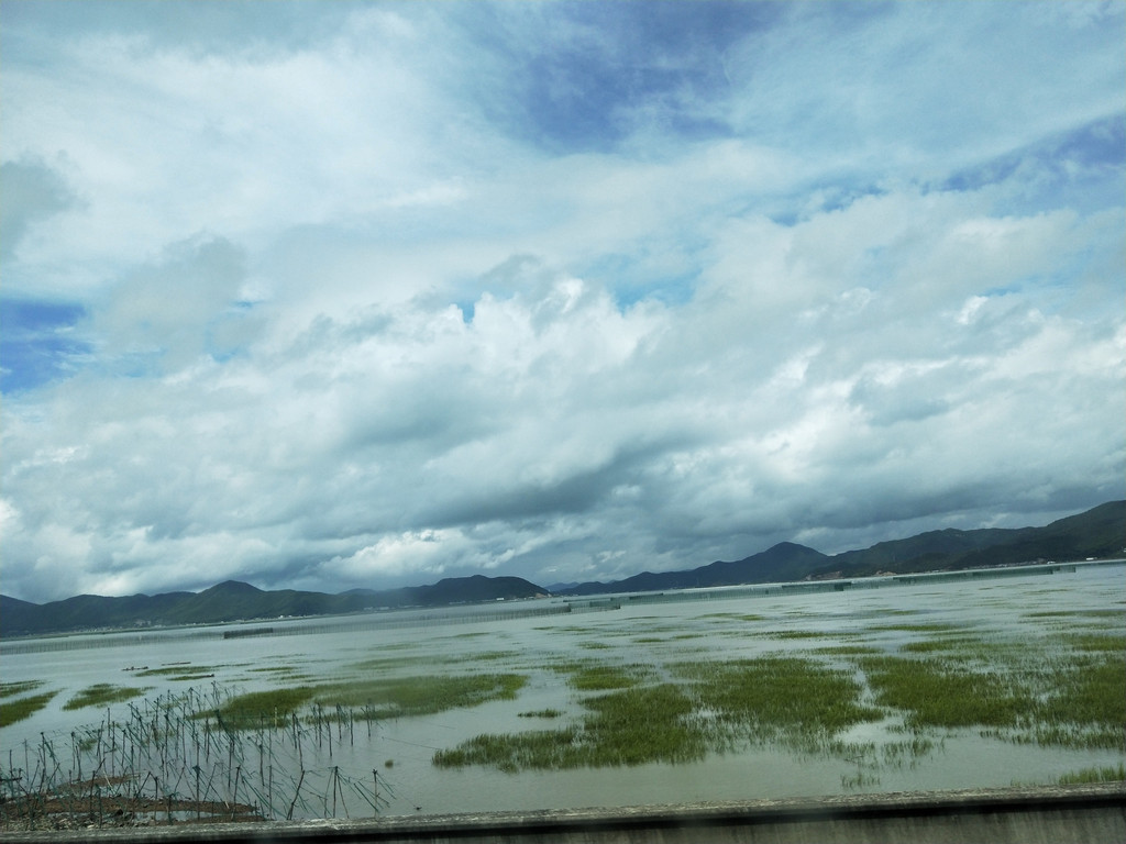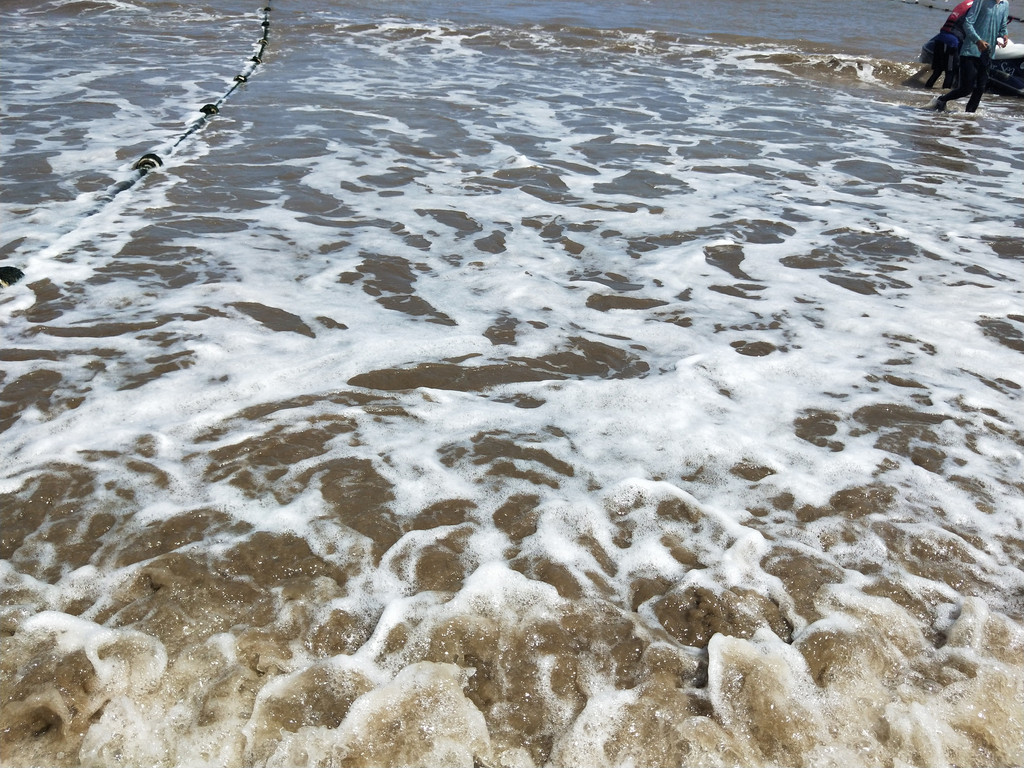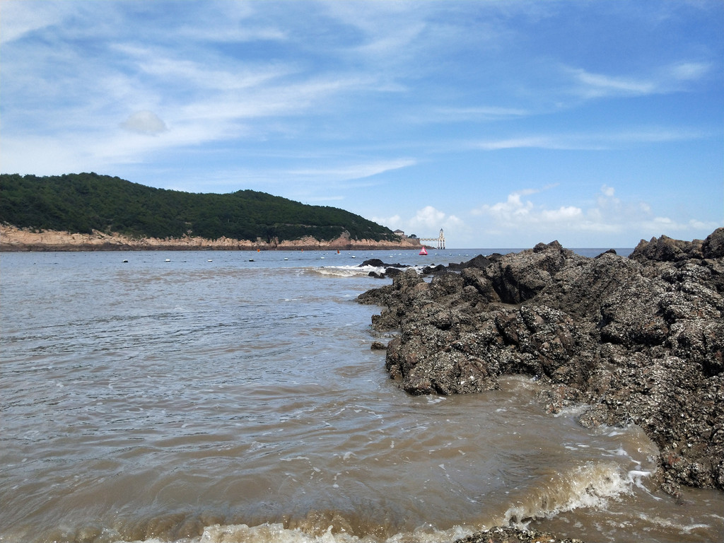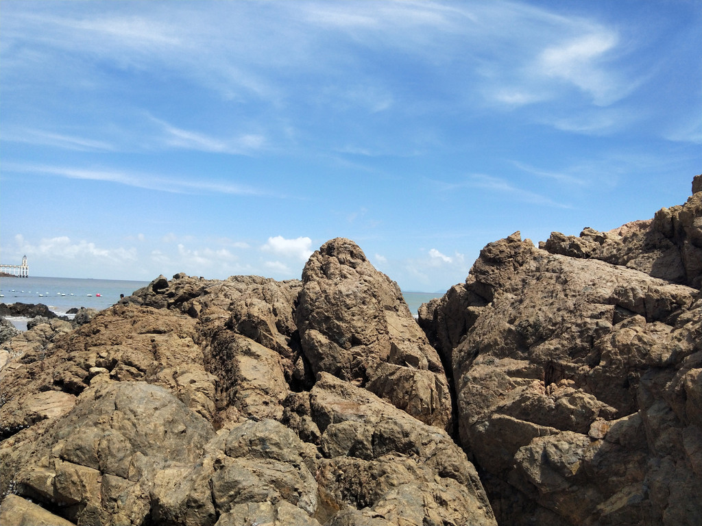 这里的海水似乎更清澈一些,虽然也是泛着黄的底色,不过在天空的映照下,还真有一种幽幽的蓝。中间又不免会出现一道一道的黄,似乎是海面的纹饰,很漂亮。
