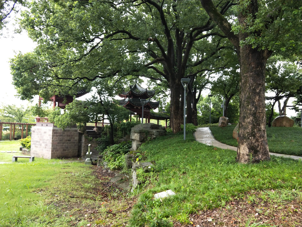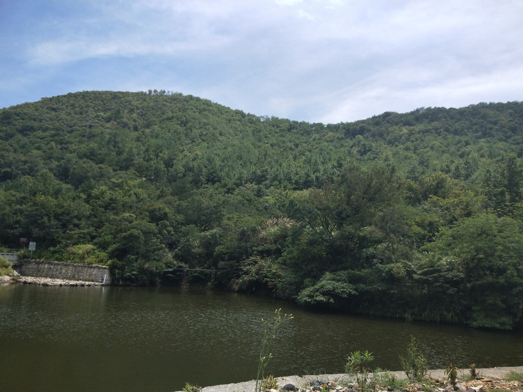 景区门口是迎宾广场,其实也不算大,不过草坪看着倒还赏心悦目。旁边有一方池塘,似乎是水库的样子,这是松兰山山塘。集雨面积0.06平方千米,坝高5.5米,看来是一个比较小型的小库。