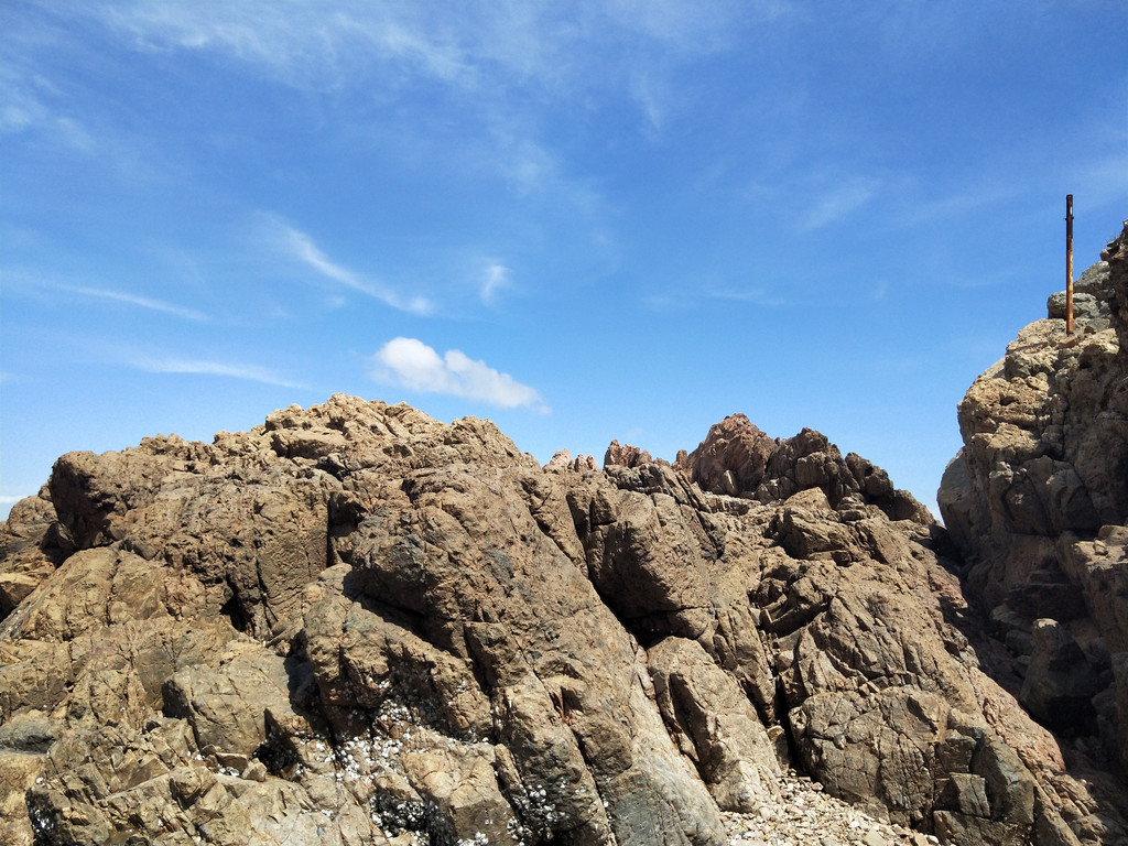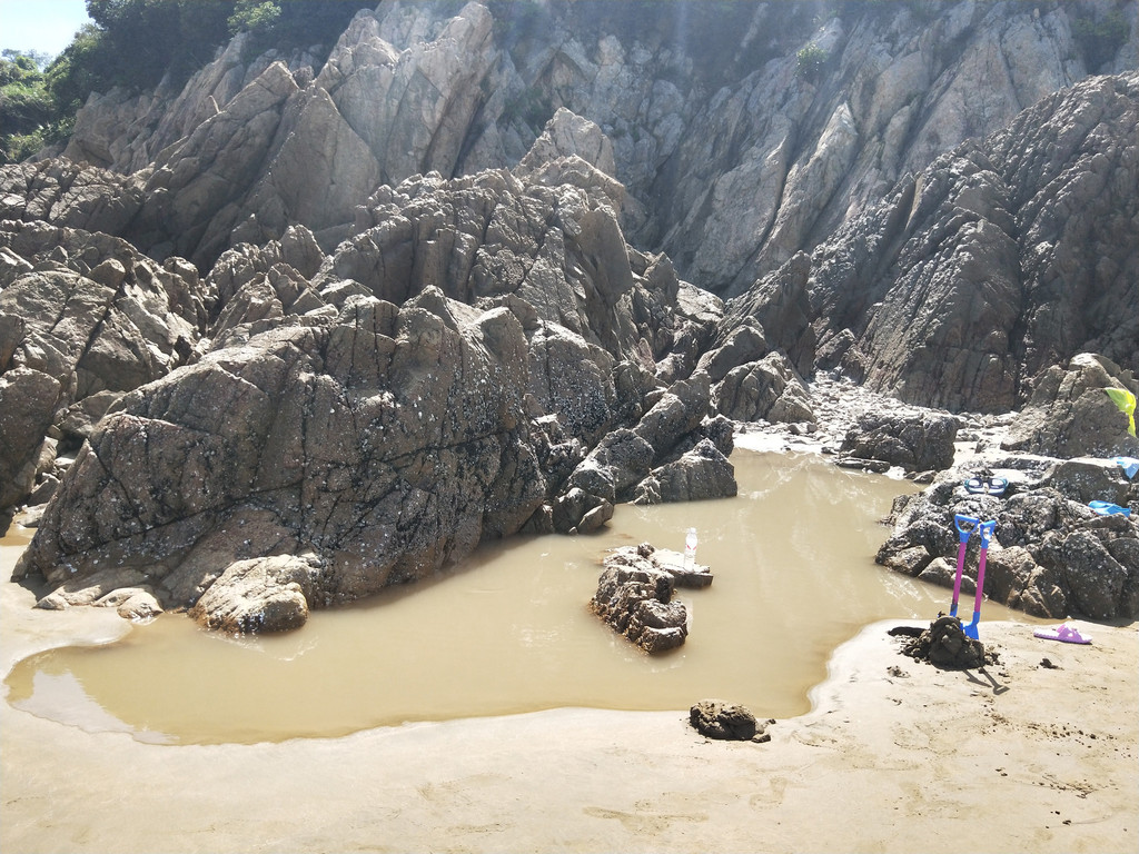 旁边还有一片岩石滩,这里的岩石已经被海浪打磨得千奇百怪,却又并不平滑,石头上有着形形色色的缝隙。小伙伴顿时来了劲头,比在沙滩上更高兴,干脆扎根在岩石堆上不走了,一会儿惊呼发现了啥,过一会儿又再次兴奋地叫起来,大概又有了什么新的发现。我催了两次,可是他却乐此不疲,完全没有走的意思。我有些无奈,只能找了块沙滩坐着,幸好还带了把遮阳伞,踩着沙滩来回散步。小伙伴则全程在阳光下暴晒,满头大汗还是兴致盎然。