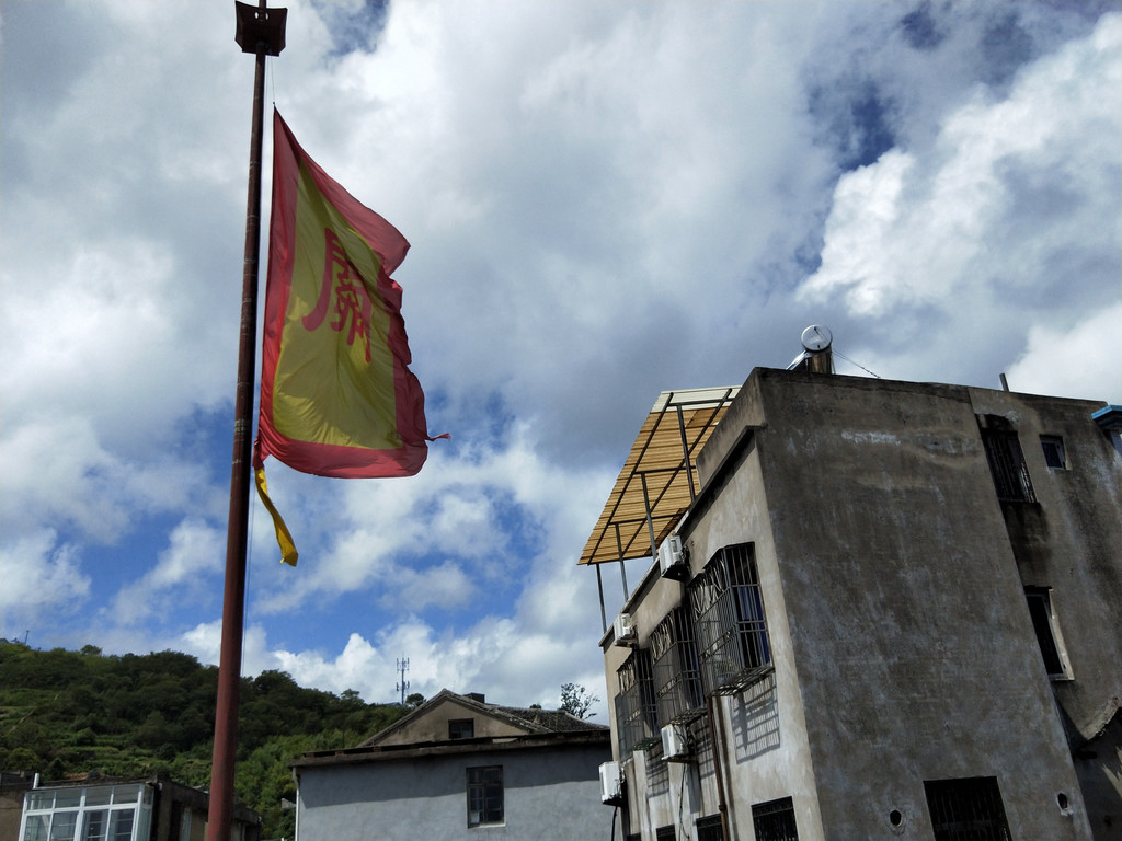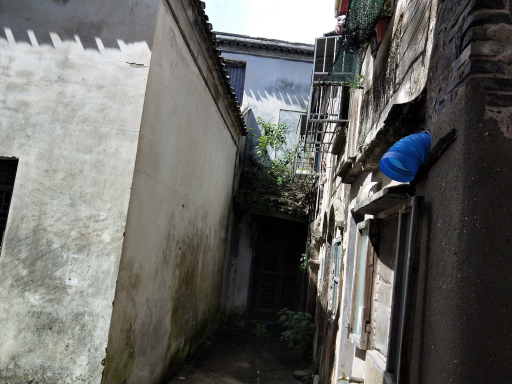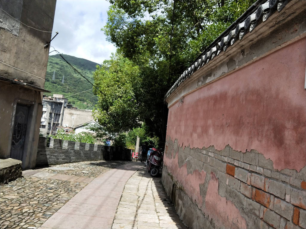 走出三合院,继续往上行,两侧的石头外墙已经露出了岁月的沧桑痕迹,看来这一带也是老房子。旁边还有小巷子,很窄,白墙大概因为潮湿的缘故,有大片的斑痕。木质的二层楼古色古香,窗户的式样不像江南古镇那么精雕细刻,只有一些简单的纹路,但是很大方。
