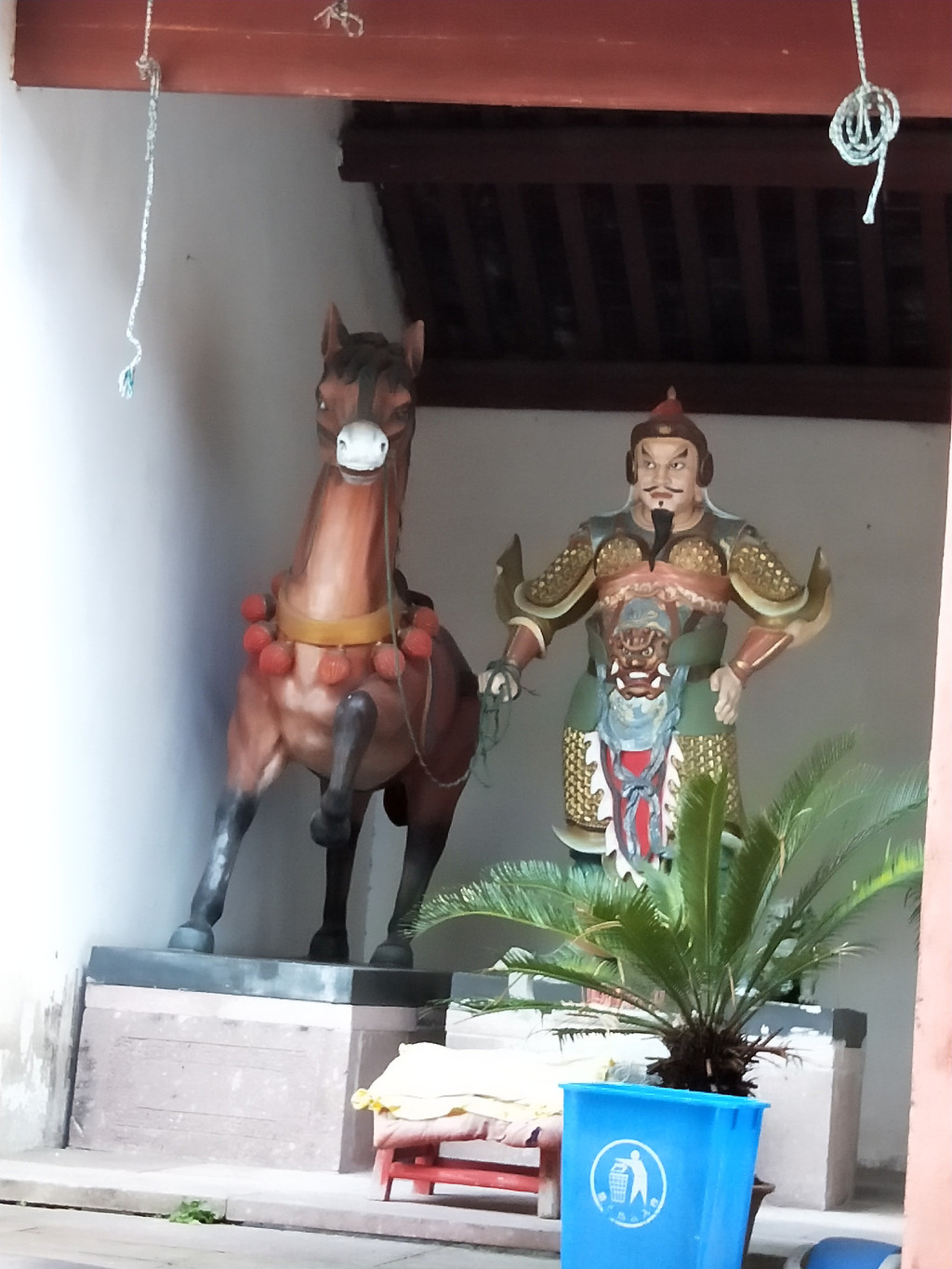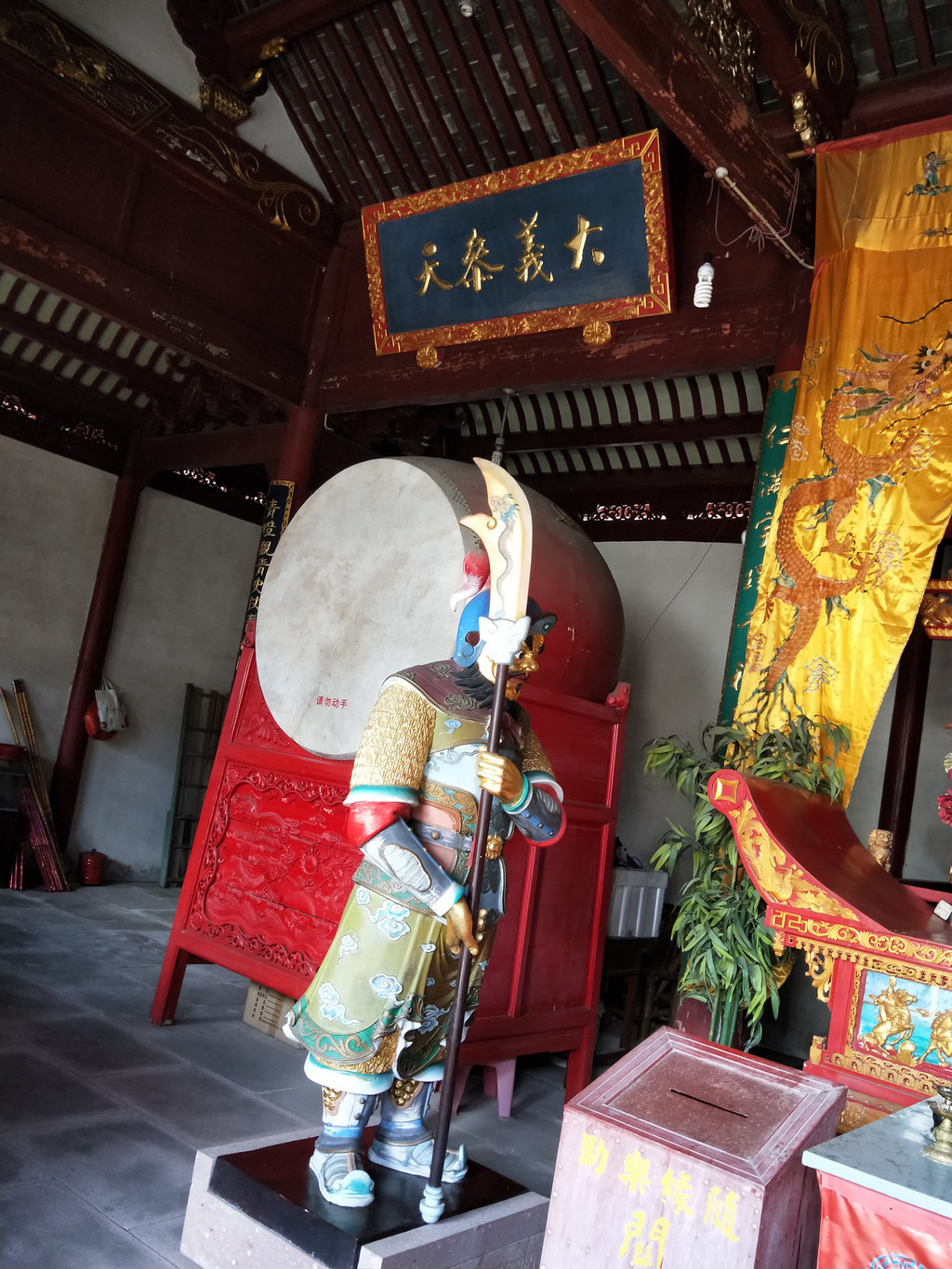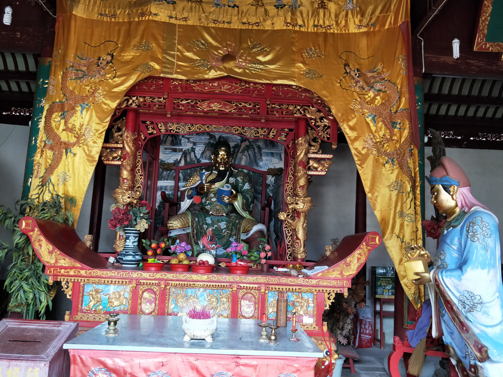 关帝庙面阔三间,里面供奉的自然是关帝,虽说身体和铠甲是镀金的,但外面的袍子却是彩塑。他一手抚须,一手握书,目光专注。他的著名的标志性兵器青龙偃月刀,则被座下的兵士抱在怀里。