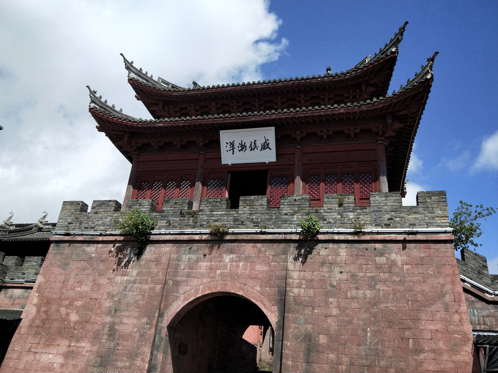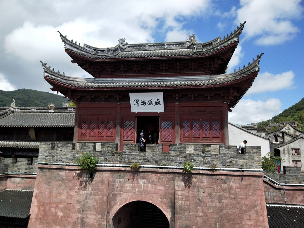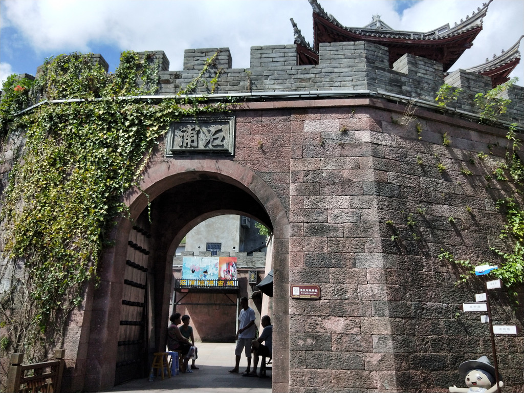 往上走就是石浦的城门,砌以红砖。旁边有一段古城墙,虽然不高,但可以看出当年的防役工事。城门上有一座翘角飞檐的建筑,上书“威震浙洋”。