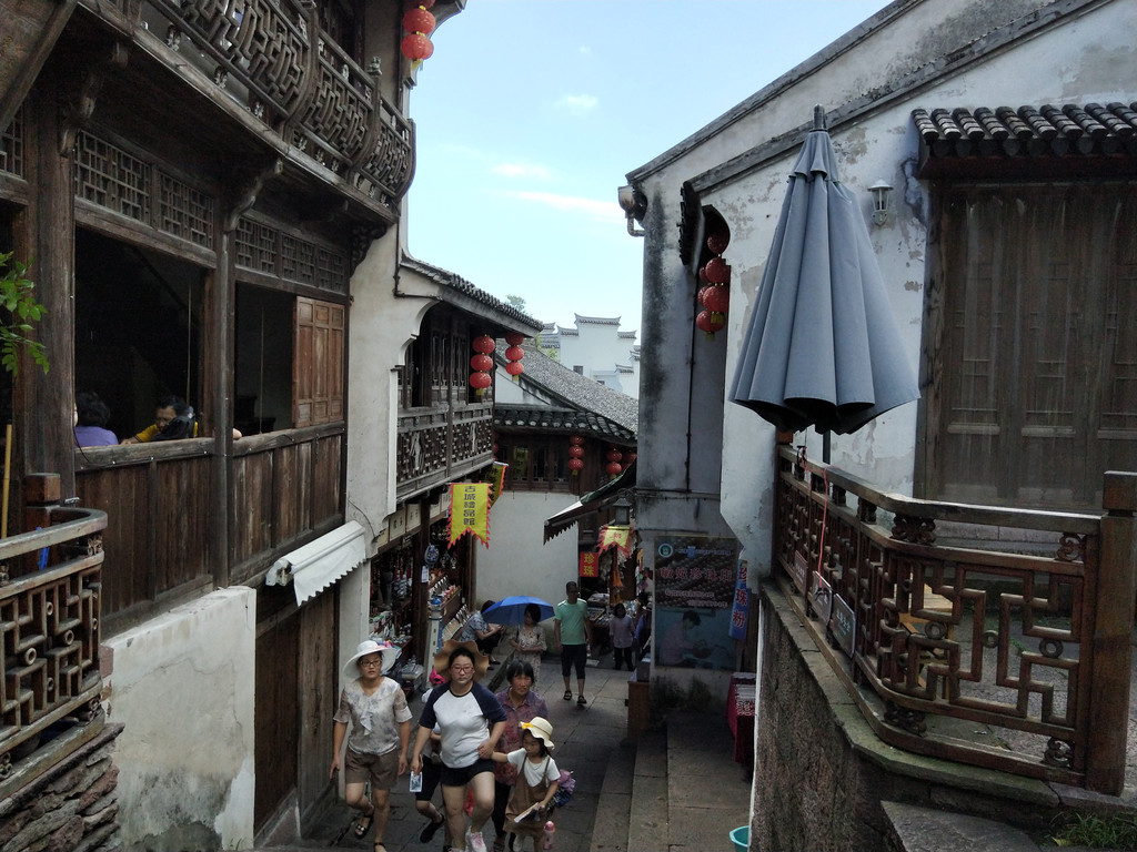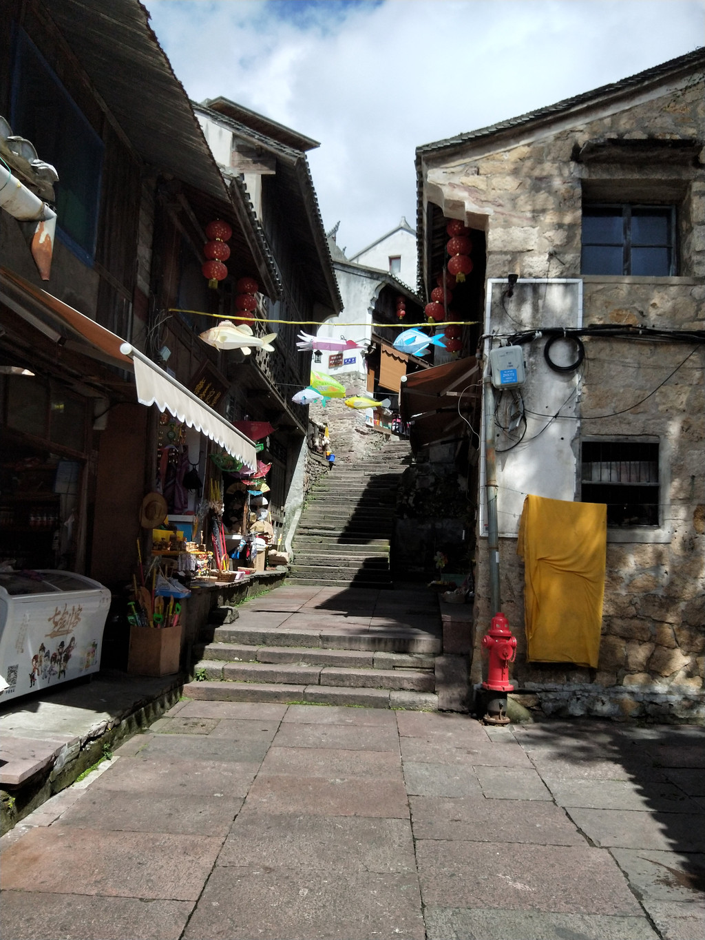 走入街口,就是一溜儿的石阶,老街就是依着山势需要往上攀登的。街道不宽,铺着长条石块。