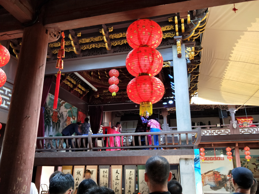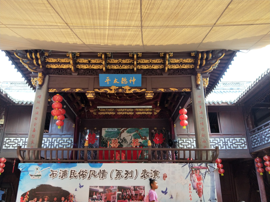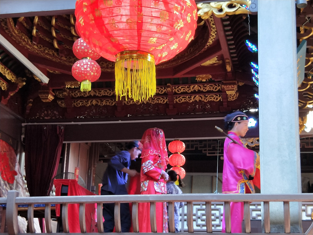 对面的古戏台正在进行表演,看表演的还挺多,上演的是一出大婚的戏码,新娘子一袭红衣,盖着红盖头,也有媒婆插科打诨。