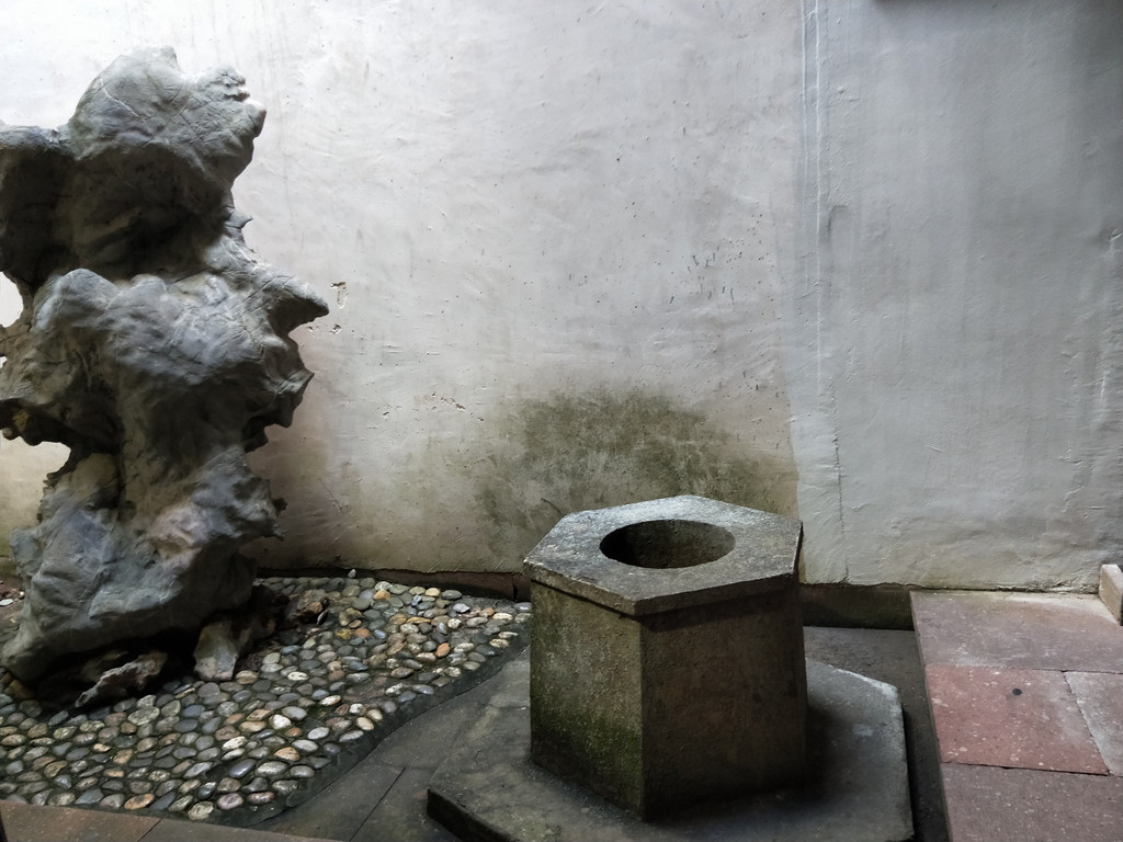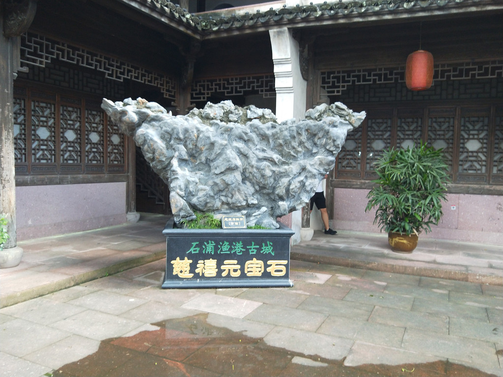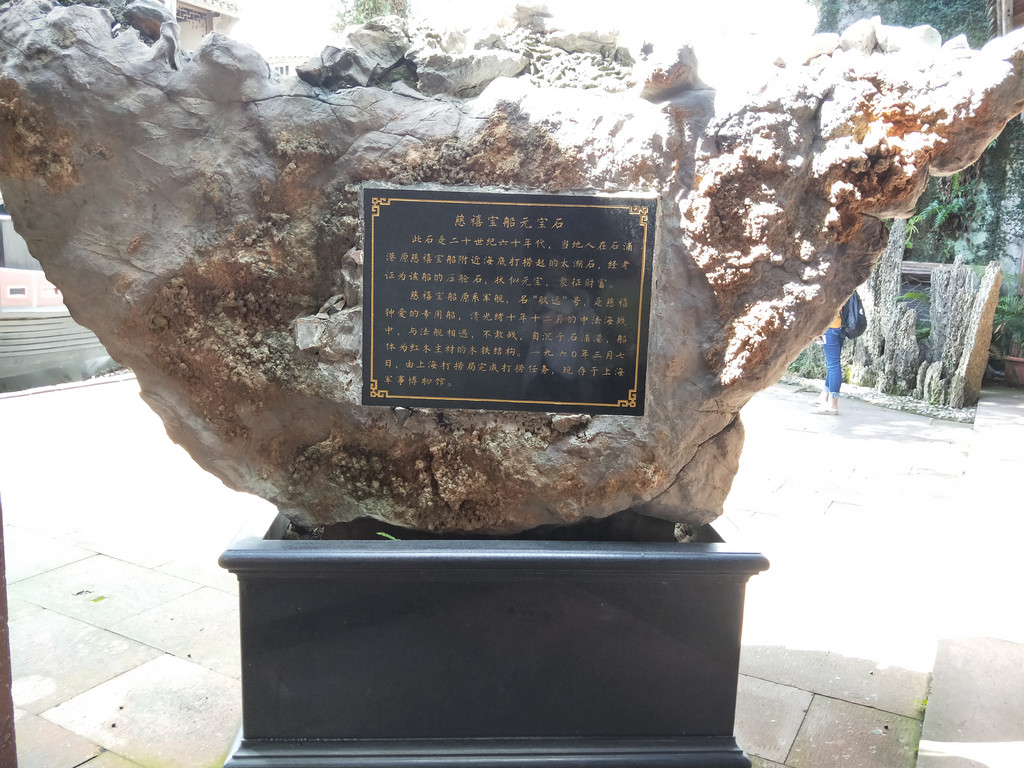 院子里还有一块慈禧元宝石,不知道是什么石材,表面凹凸不平,却呈现出元宝的形状。背后有文字,原来这块石头是上世纪六十年代从海上打捞上来的太湖石,打捞的地点就在原来慈禧宝船的附近海底。因为状似元宝,象征着财富,可能是这艘宝船的压舱石。当时在海上与法舰相遇,不敢战,自沉于石浦港。