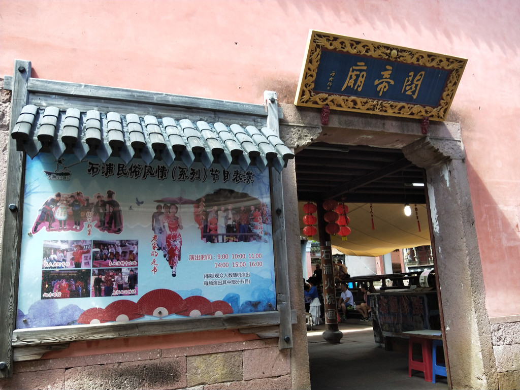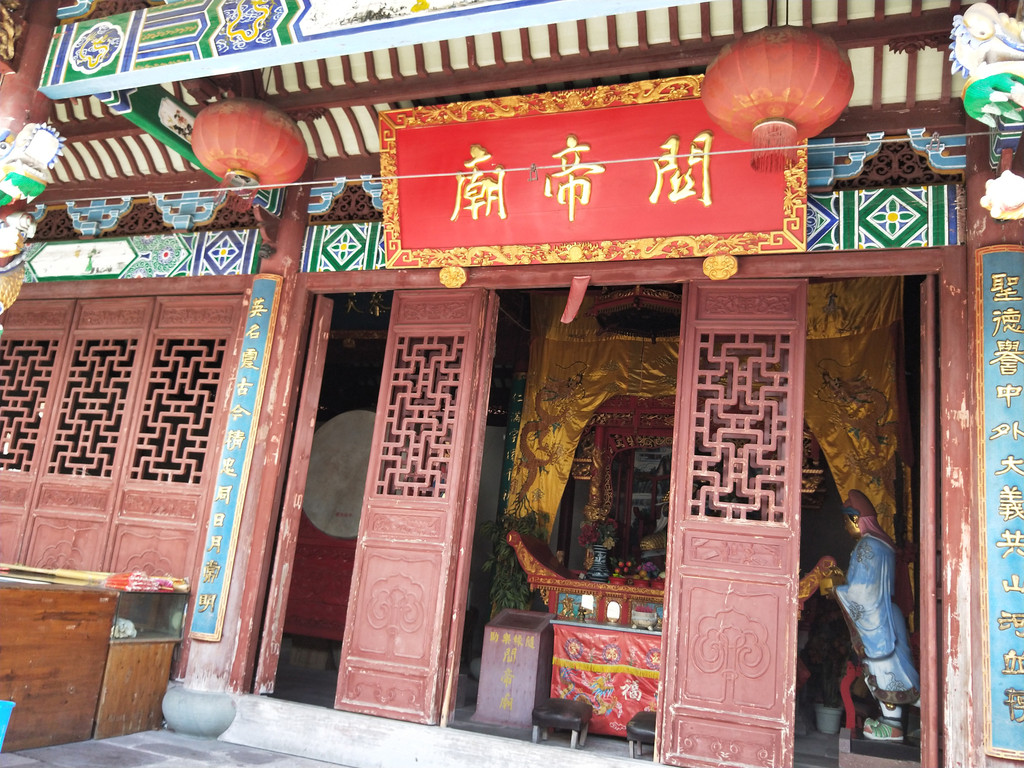 庙宇外侧是朱红的墙体,里面的墙面上画着“温酒斩华雄”“千里走单骑”等国民耳熟能详的故事。