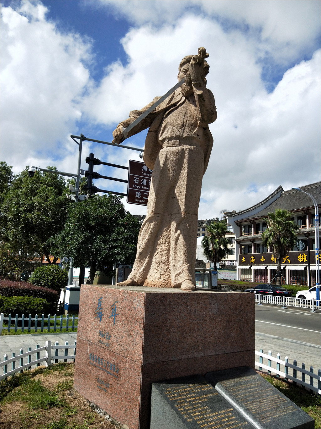 从广场往海边走,还有一尊聂耳的雕像,他临风而立,正在全神贯注地拉琴。基座上还有八个大字“居安思危,聂耳永生”。