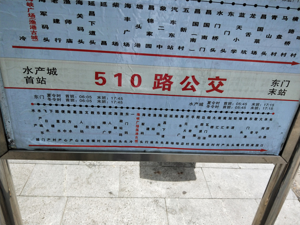 旁边是渔港码头,对面就是东门岛,可以乘船前往东门岛,不过班次比较少。我们研究了一下公交线路,发现还有公交车可以前往,似乎更方便一些。当然,今天是太晚了,我们计划明天一早出发。