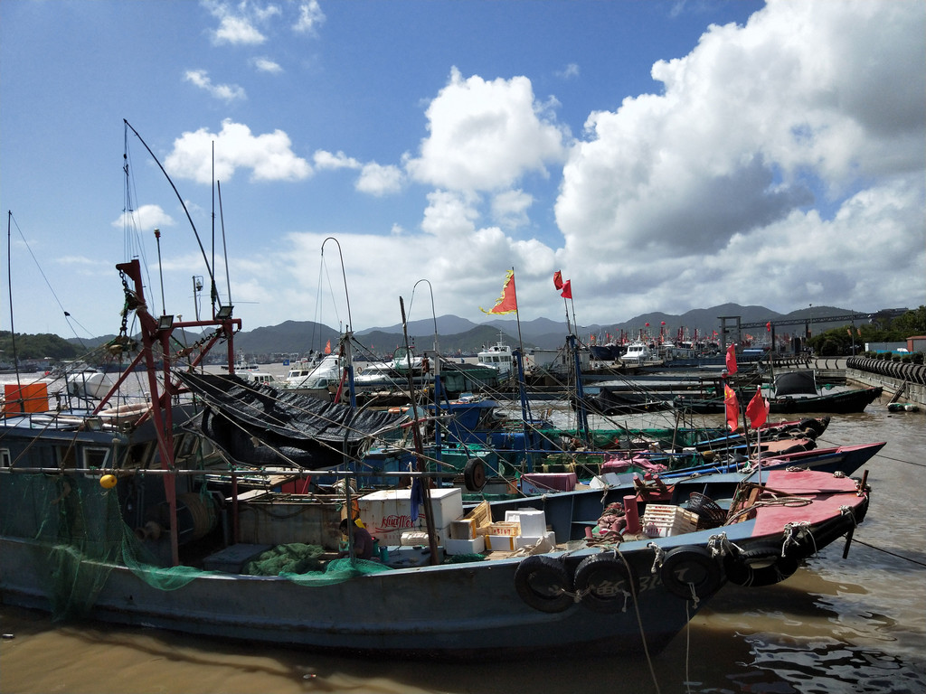迎着海风走到海滨,一溜儿的渔船排在海边,船头插着的红旗迎风飘展。一眼看过去,渔船排得几乎看不到头,非常壮观。现在还在休渔期,到开渔节后,这些渔船万舟竞发,想想都觉得热血沸腾。我们两次前来宁波,上次没有来石浦,非常巧的是都选在八月份。