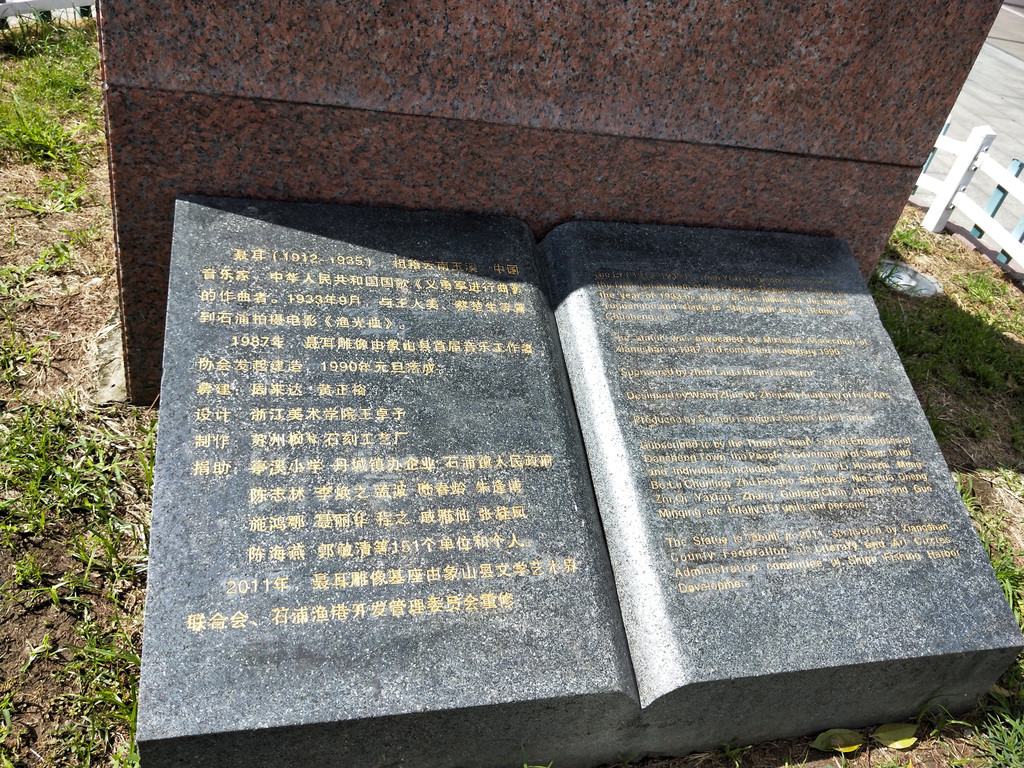 聂耳是我国著名的作曲家,国歌的作曲者。聂耳来到石浦,是与《渔光曲》摄 制组三十余人一起来的,当时的外景地主要是在东门岛,当然其他地方也取过一些景,包括古城和中国渔村等地。《渔光曲》这部影片创下了连续八十四天上座率爆满的记录,随后在莫斯科国际电影节上获得了荣誉奖,成为中国第一部获国际奖的影片。当时聂耳年仅二十一岁,还是个满怀着憧憬和浪漫的文艺青年。当他面向大海,悠扬地拉着小提琴,乐曲悠扬地从指尖流淌,我仿佛听到了《渔光曲》的音调。其实我没有看到《渔光曲》,不过去石浦古城的时候还是到网上听了主题曲。虽说这首歌曲作于一九三三年,但是今天听起来,尤其是在海滨渔村听起来,还是非常好听:“云儿飘在海空,鱼儿藏在水中,早晨太阳里晒鱼网,迎面吹过来大海风。潮水升,浪花涌,鱼船儿飘飘各西东,轻撒网,紧拉绳,烟雾里辛苦等鱼踪,鱼儿难捕船租重,捕鱼人儿世世穷。爷爷留下的破鱼网,小心再靠它过一冬……”
