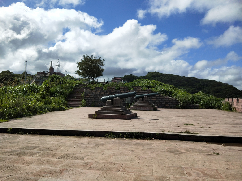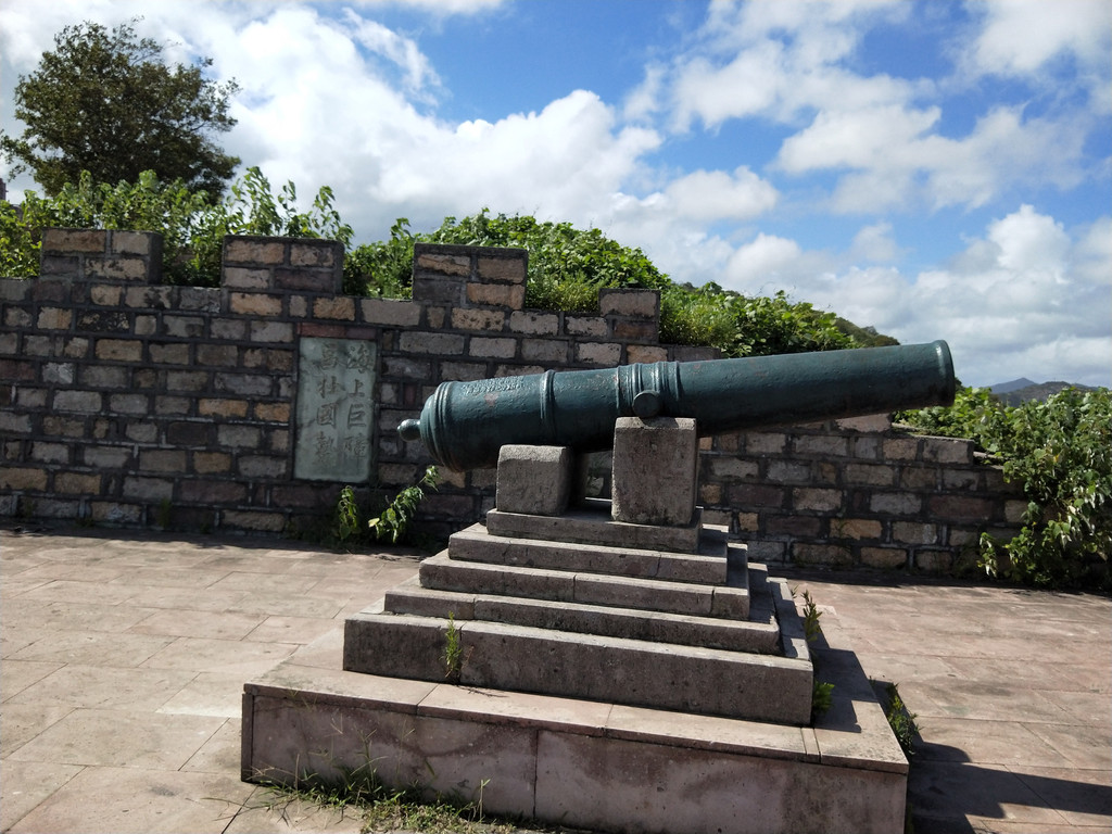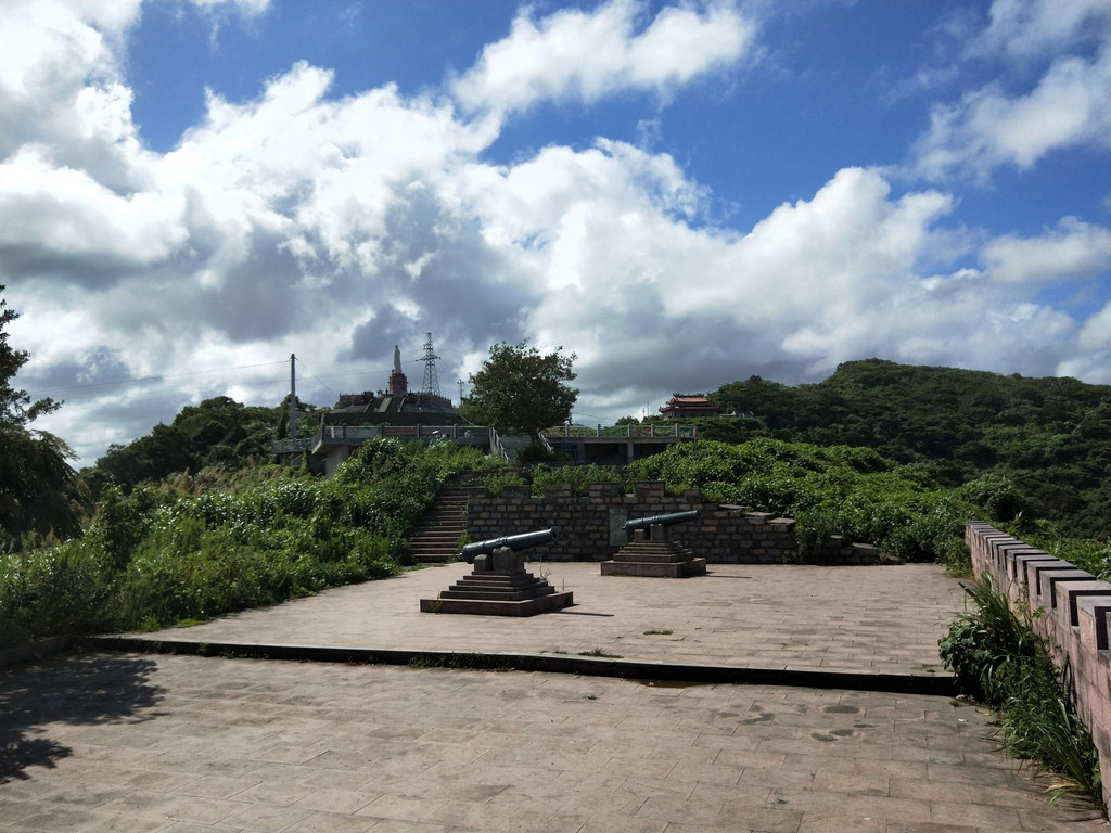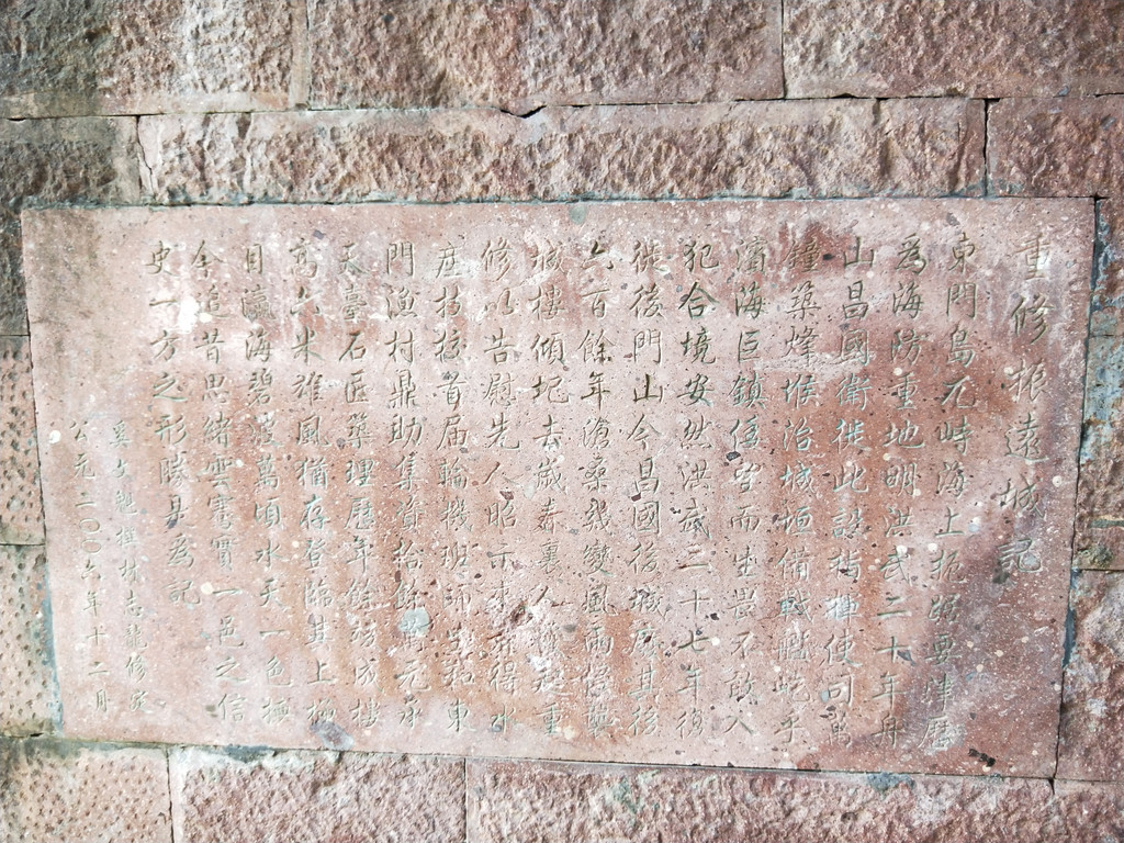 山顶是一个大平台,这也是炮台,两门铜炮虎视眈眈地正对着前方的出海口。旁边是城墙,当时是用来抗击倭寇的。旁边的墙上,刻着八个字:“海上巨障,昌壮国势”。如今当然用不着这两门炮来守卫海疆了,但历史永远铭记着它们。
