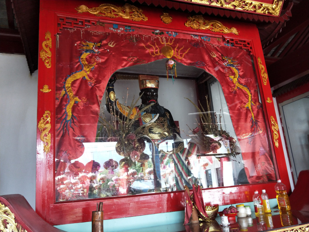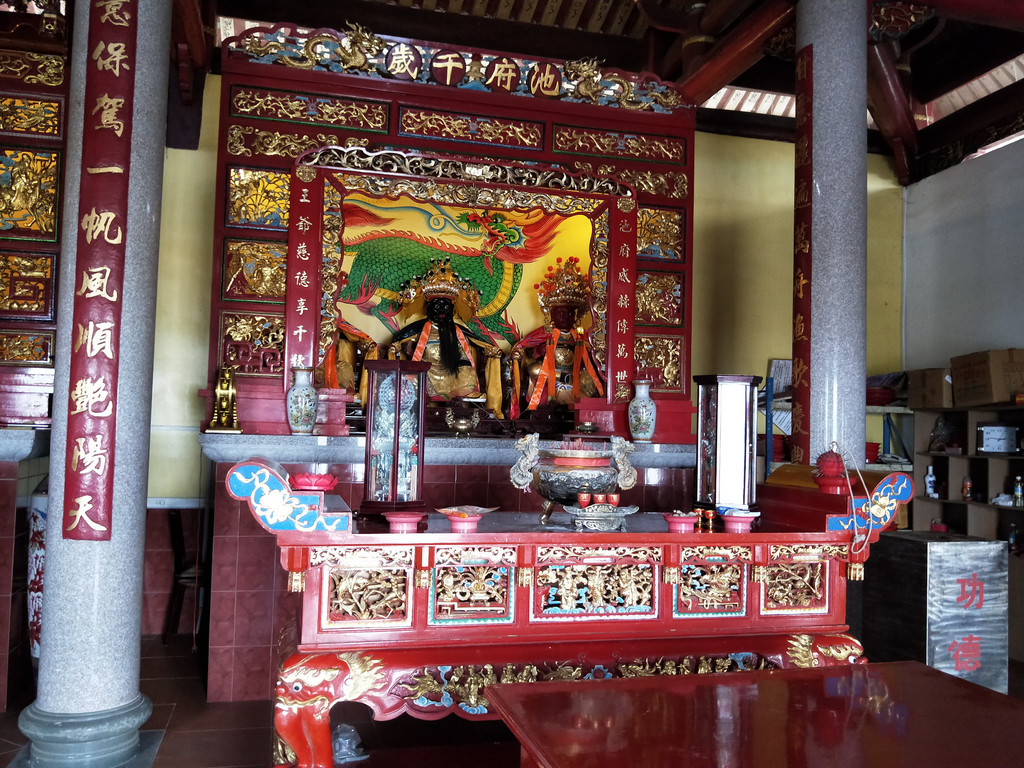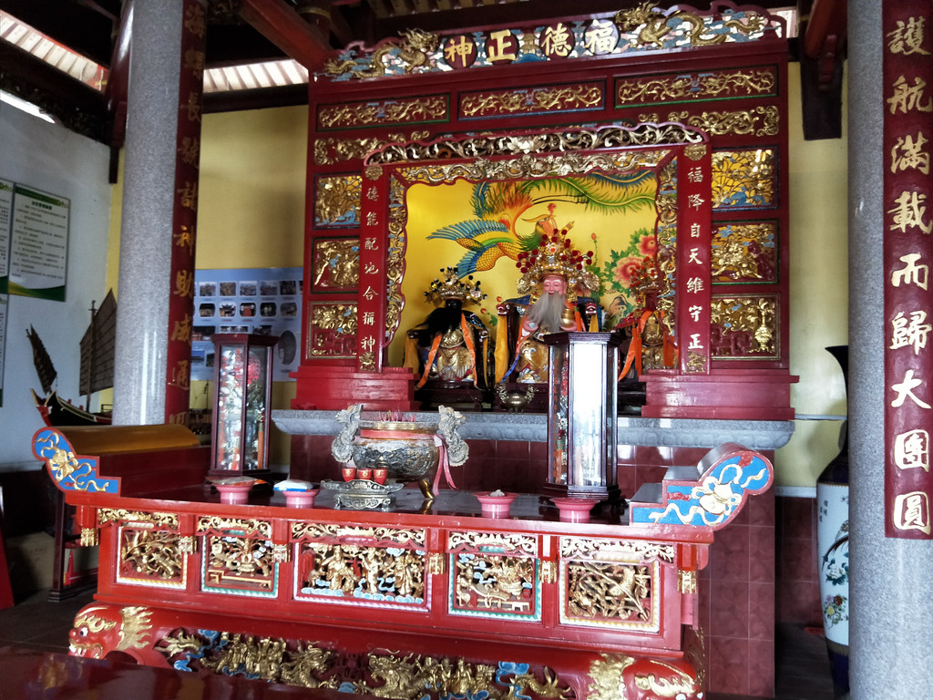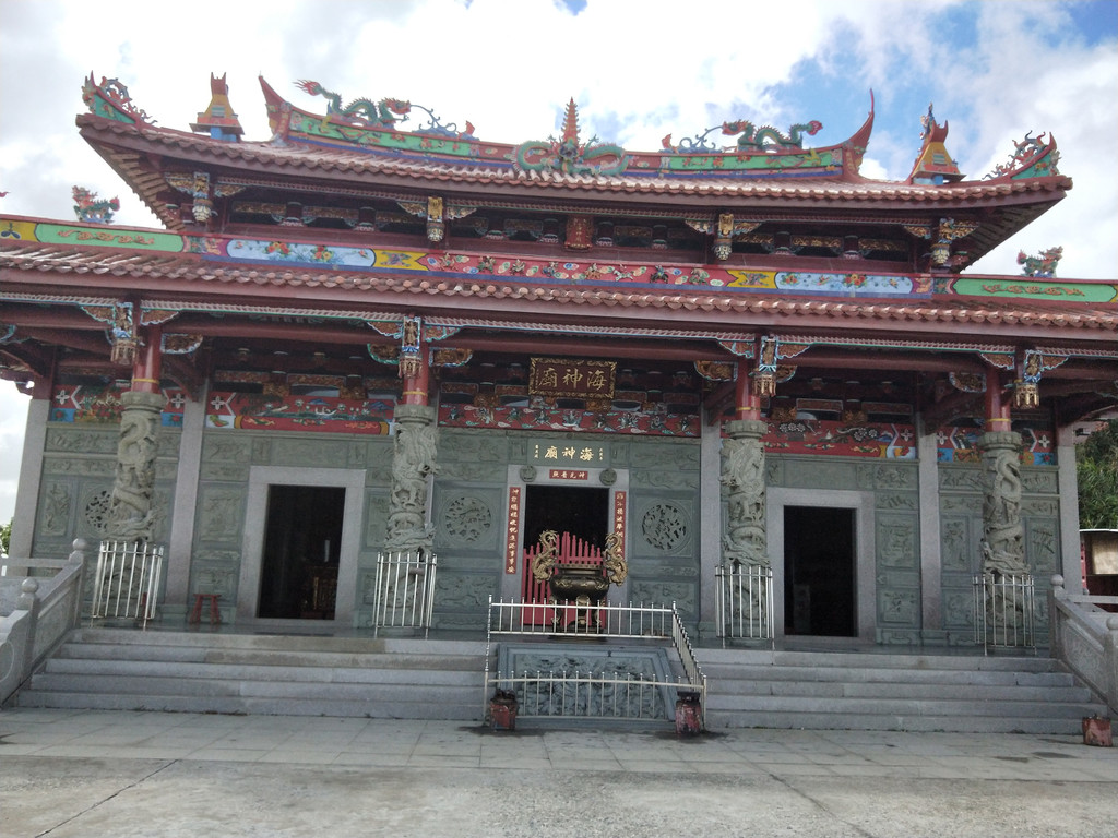 前面还有一座海神庙,踏上十八级台阶,门楼、戏台、厢楼和大殿依次排开,大殿正中是妈祖神像,两旁有千眼睛、顺风耳的神像。这座妈祖庙规模宏大,雕刻精美,不过除了妈祖,还有其他信奉的形象我实在是认不出来。中国渔村的广场上有十八尊海神,难不成他们也是海神?