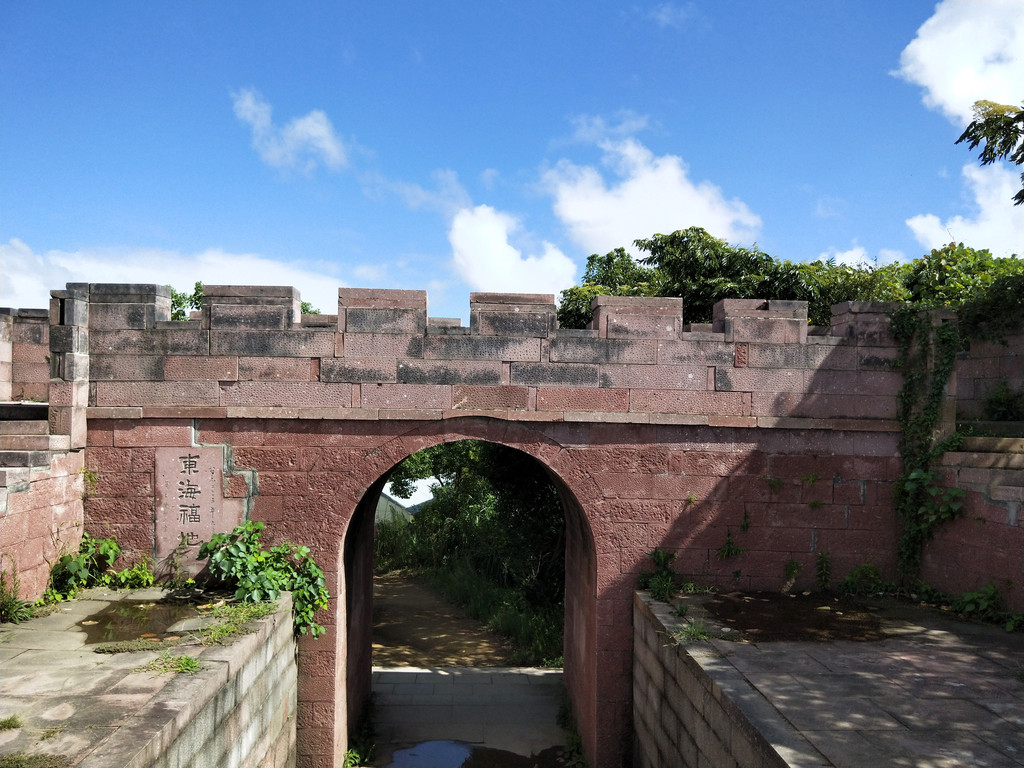 往上走是一座城门,通体用红砖砌就,中门是拱形门,门上刻着“振远城”,两侧有一对石狮拱卫。早在唐神龙二年,象山立县时东门渔村就是辖区之一。宋朝立东门寨为象山历史第一兵营,元朝的时候设巡检司。明洪武年间倭寇猖獗,多次从海上偷渡入境,烧杀掳掠无恶不作。朱元璋把舟山境内的昌国卫移到象山东门岛,与宁波卫、定海卫、观海卫一起,被称为中国四大卫。清朝的时候,设石浦所,可见自古以来,东门岛就是海疆战略要地。