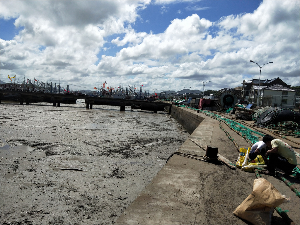 公交车站就在海滨,所以我们转了个方向,就看到了海。让人震惊的,还是海边泊着的密密麻麻的渔船,这些渔船一字排开,整齐地停泊在海边滩涂。渔船的式样并不一样,大多数渔船和我们在渔港看到的差不多,但也有相当漂亮的白色渔船,看起来造价要更高一些,造型也更现代化一些,想来功能也更多一些。