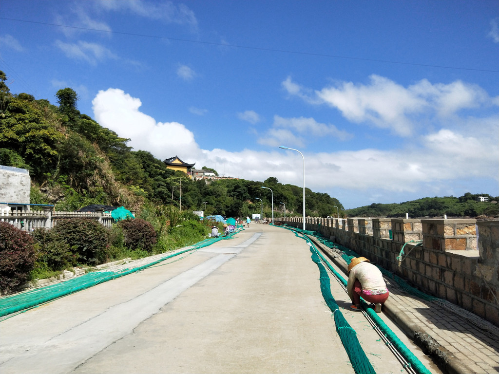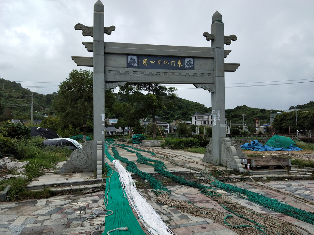 隔路是东门休闲公园,不过入口处晒着渔网。这些渔网可真长啊,不是我印象里那种可以挂起来晒在竹竿上的渔网,它们在路边迤逦成了几十米上百米的距离,还有当地的渔民正埋头修补渔网。