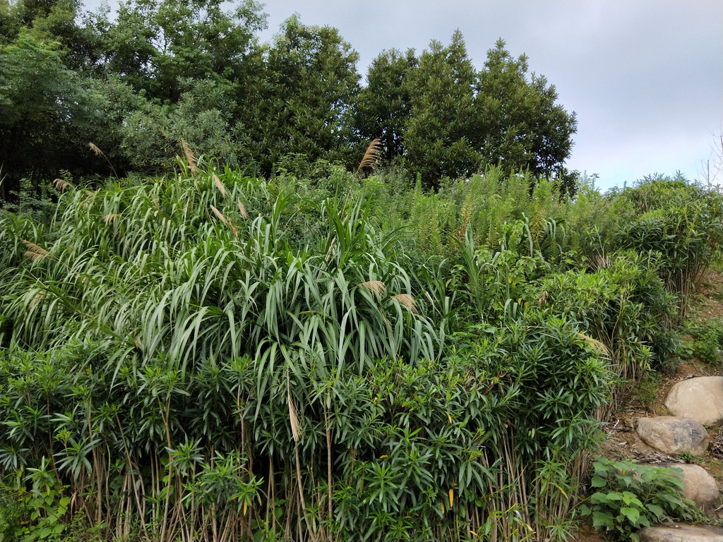 坡上堆了一组乱石,已经被打磨得很圆润。不知道这是从山上开采下来的,还是从别处运来的。比对了一下山体,似乎这些石头并不是人家“自产”的。坡上有一段砖墙,掩映在茂密的夹竹桃间。墙体上爬满了绿色的藤蔓,差不多类似于爬山虎一类的植物,露出了一个砖墙的角,还挺有味道。
