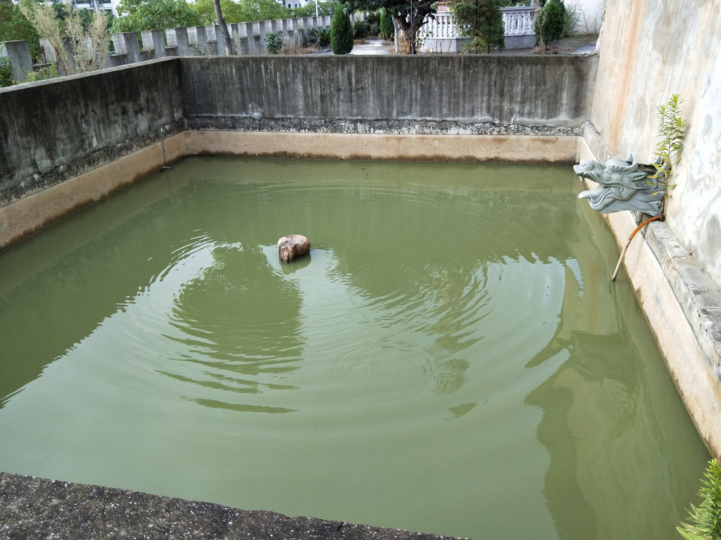 旁边有条路可以通过去,先看到了放生池,呈长方形,一面是墙,从墙上伸出个龙头来。池子中间是一块圆石,我原以为是鼋或龟之类的形象,但是看了又看,似乎就是一块圆润的石头。
