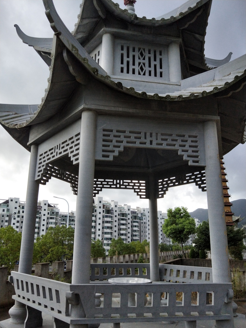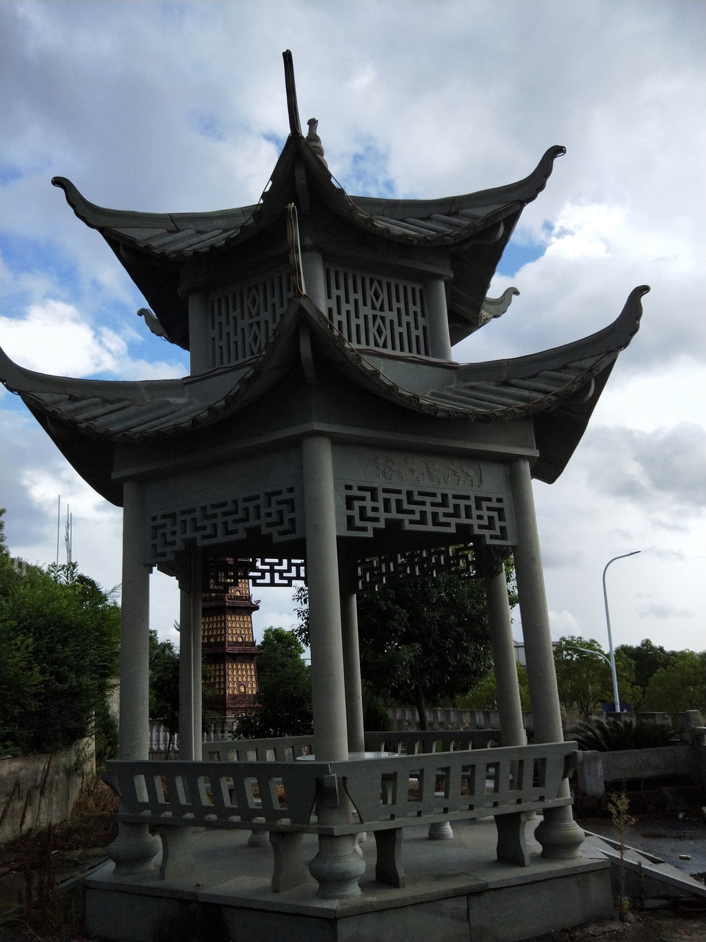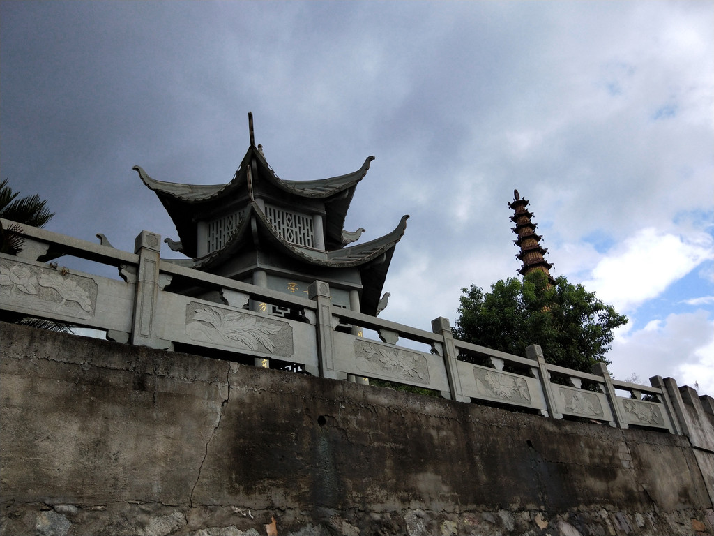 爬上台阶,登上玉兰亭,这里的地还不够高,没法一览象山城。不过,倒是让我看到一侧的非常苗条的宝塔,通体金色,九层,看样子旁边是一座寺庙啊。