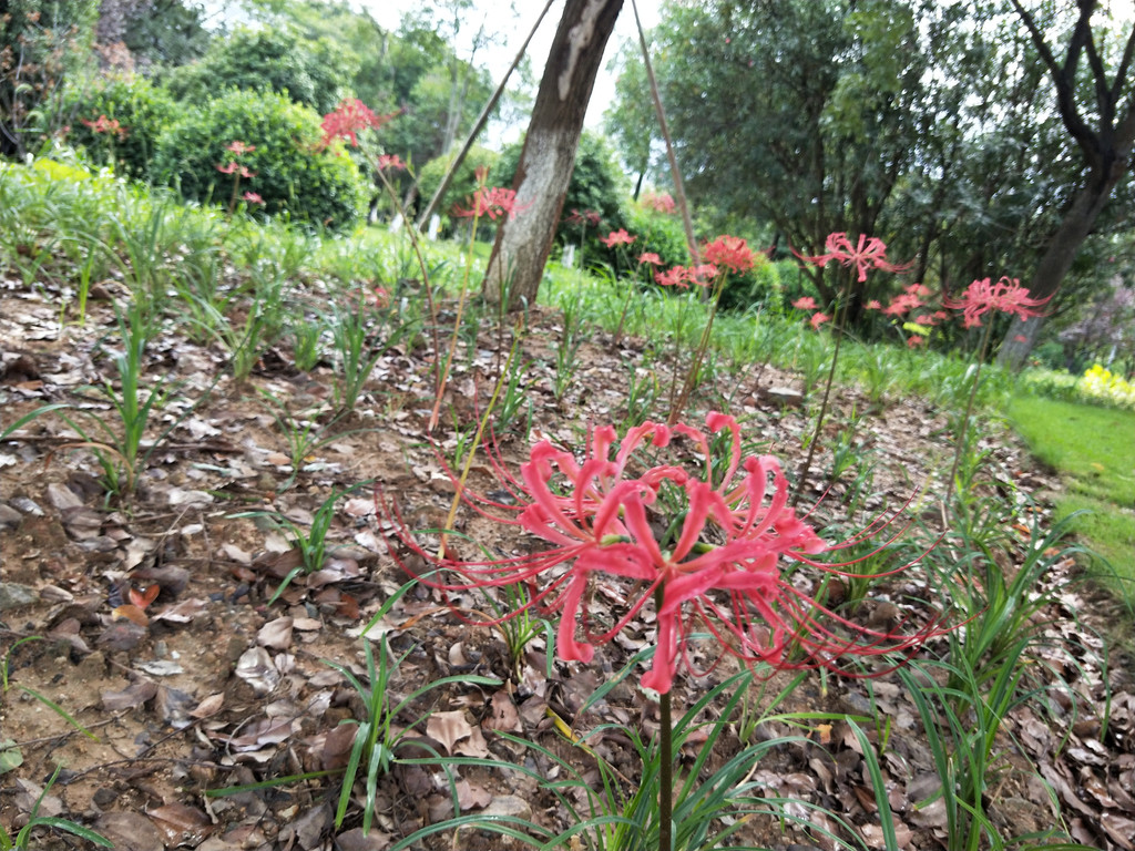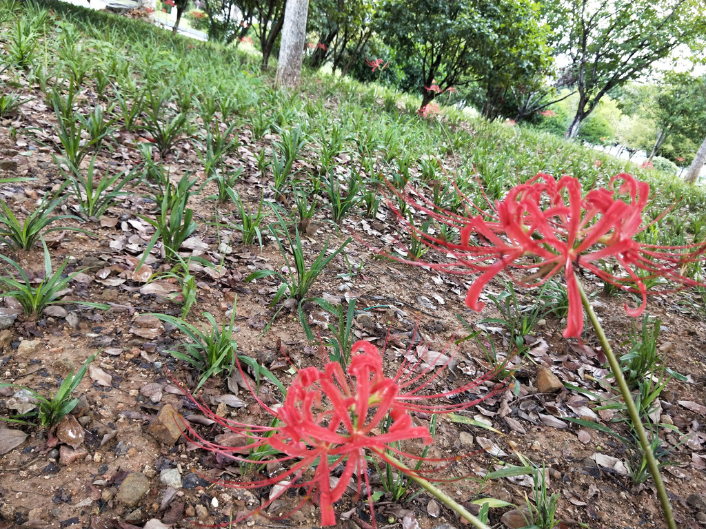 扫了辆共享单车,就往史家山的方向骑过去。沿途看到了一片绿地,勉强也算是个公园了吧,不过没有看到名字,大约算是一块绿地。倒是栽种了一些花,曼殊沙华居然开得还挺茂盛,花季来得比我们江阴更早一些了。